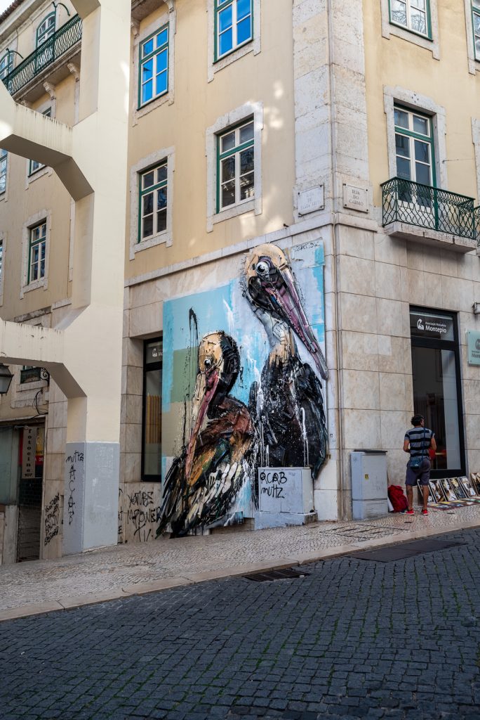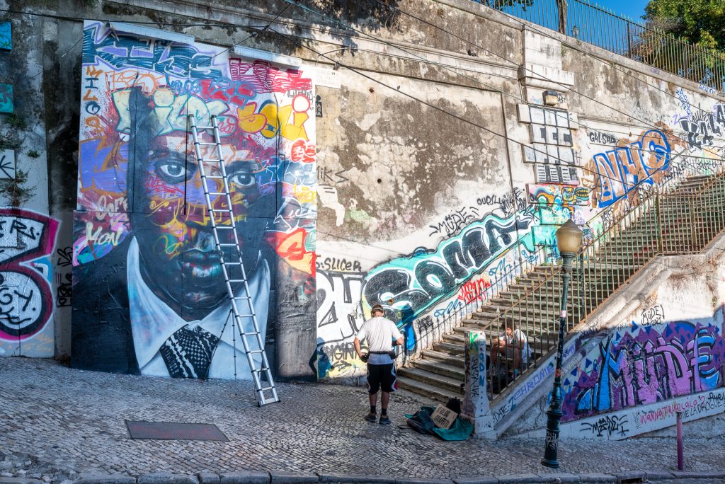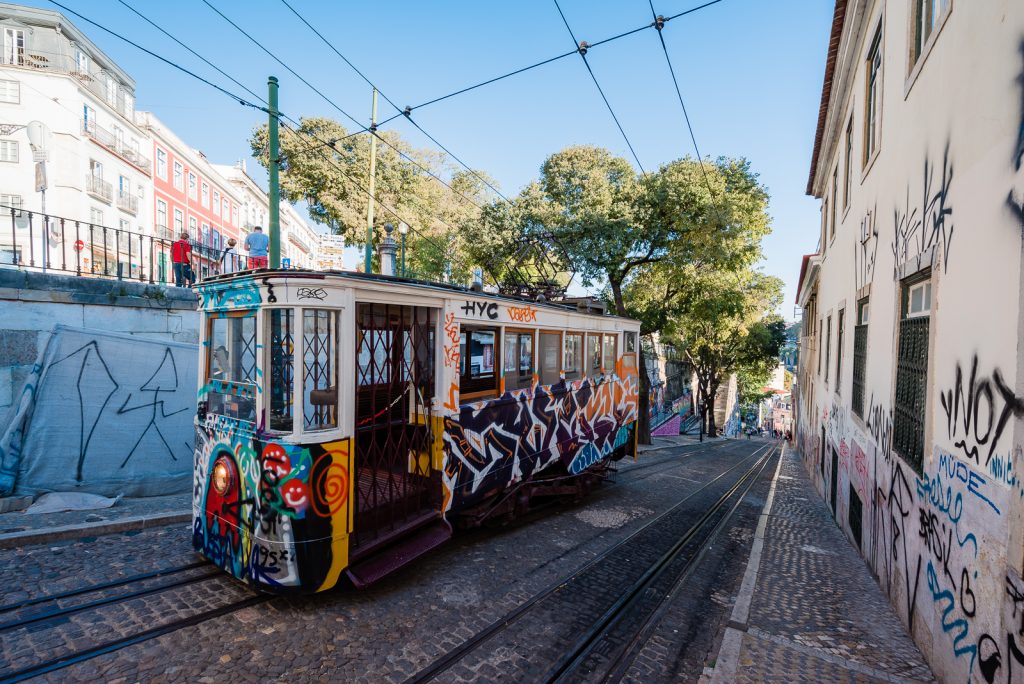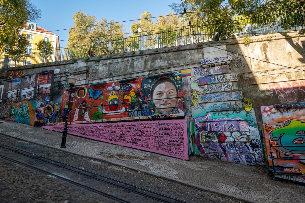 An meinem zweiten Tag in Lissabon bin ich zu einem ersten Spaziergang durch Baixa gestartet. Zunächst ging es zu Fuß das steile Sträßchen hinunter, auf dem auch der Elevador da Glória fährt, eine der Schrägbahnen von Lissabon. Dort konnte ich einen Straßenkünstler bei der Arbeit betrachten, der gerade dabei war ein neues Graffiti an eine der Mauern zu sprühen. Überhaupt waren die Mauern auf dem Weg hinunter nach Baixa mit einer Vielzahl von Graffitis dekoriert. Und auch die Schrägbahn selbst war mit Graffitis besprüht.