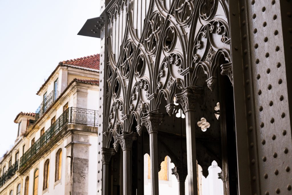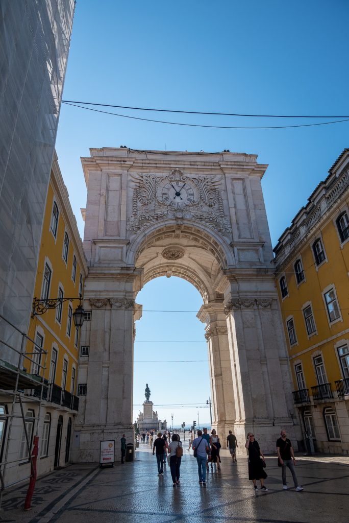 Nachdem ich eine Weile die Aussicht auf Lissabon genossen hatte, bin ich mit einem ziemlich versteckten normalen Aufzug wieder runter zum Fuß des Elevador de Santa Justa gefahren. Dort habe ich noch einige Detailaufnahmen der Verzierungen des Elevator de Santa Justa gemacht, bevor ich über die Rua Augusta, durch den Triumphbogen Arco da Rua Augusta hindurch bis zum Praça do Comércio gelaufen bin.