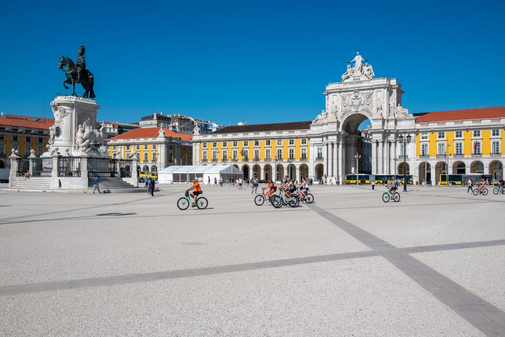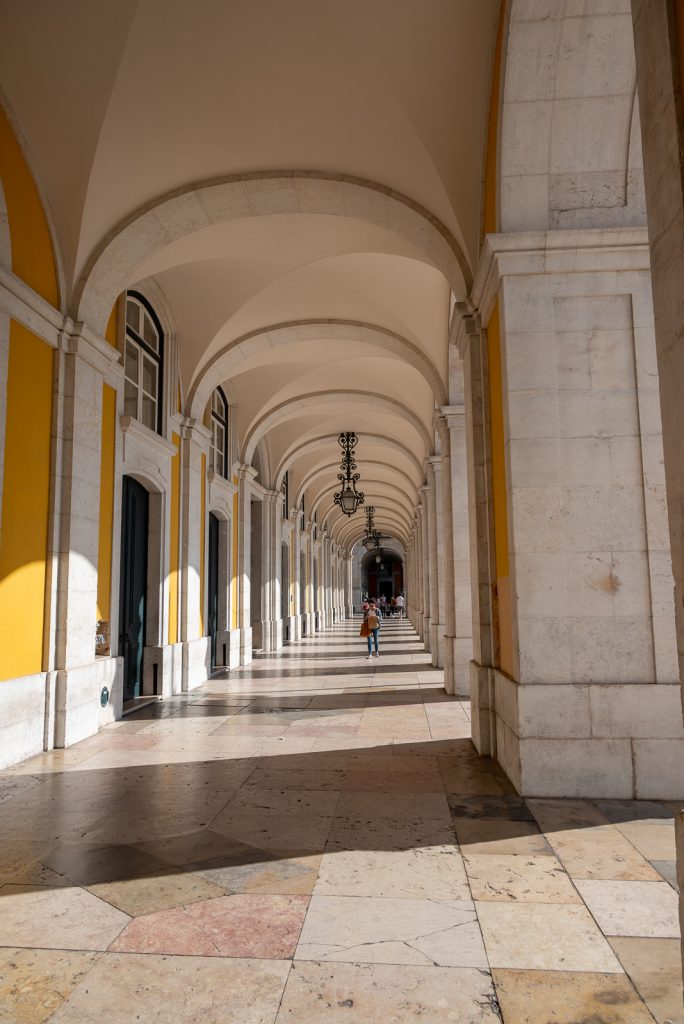 Der Praça do Comércio wird auf drei Seiten von schattigen Arkaden umrahmt und auf der vierten Seite von einer Kopfsteinpflasterstraße vom Cais das Colunas und dem Tejo getrennt.