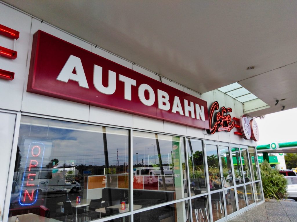 Nachdem ich Auckland hinter mir gelassen hatte, bin ich erstmal an einer Service Station rausgefahren, um eine halbe Stunde Pause zu machen. Lustigerweise hieß die Gaststätte Autobahn Café.