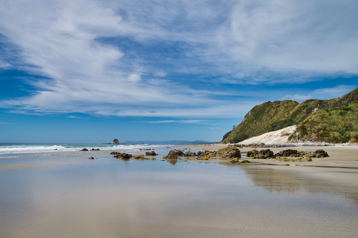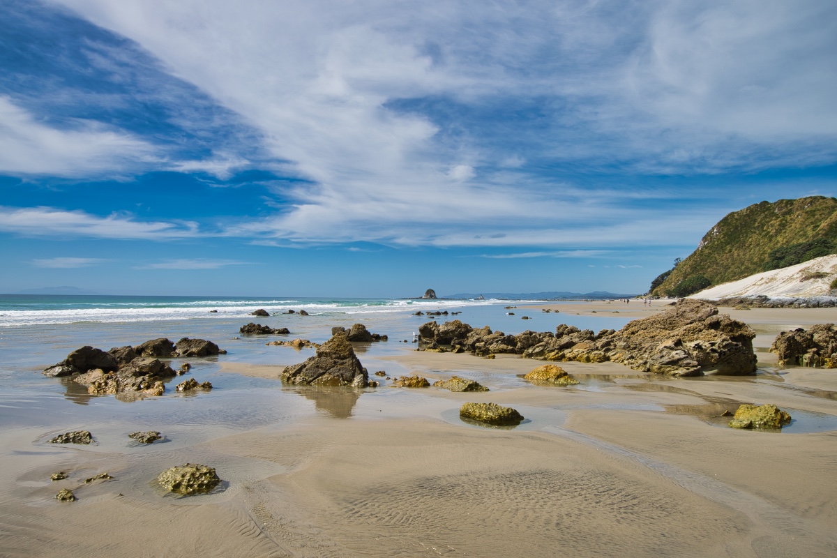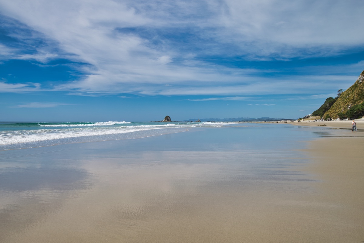 Wieder zurück in Mangawhai Heads habe ich mir noch schnell beim Supermarkt FourSquare eine Beef & Ale Pie und Wasser besorgt, bevor ich mich gegen 12 Uhr auf den Weg nach Hot Water Beach gemacht habe. Die Fahrt in Richtung Coromandel Halbinsel führte mich zunächst wieder zurück in Richtung Auckland. Dabei habe ich dieses mal die kostenpflichtige Toll Road genutzt. Für 2,40 NZD ein echtes Schnäppchen und sehr angenehm zu fahren. Endlich mal so etwas wie eine Autobahn hier in Neuseeland. Um Auckland herum war sehr viel Verkehr und ich musste mich ziemlich konzentrieren, aber mittlerweile klappt es mit dem Linksfahren schon recht gut. Besonders schön war, dass ich wieder über die Harbour Bridge gefahren bin und so noch einmal einen Blick auf Auckland mit dem Skytower werfen konnte.