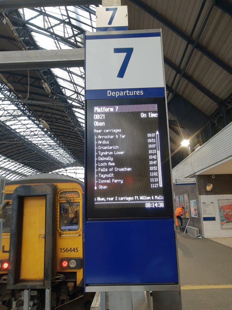 Die fünfte Etappe unserer langsamen Anreise auf die Äußeren Hebriden war die Zugfahrt von Glasgow nach Oban. Um 8:21 Uhr sollte es losgehen. Gut gelaunt passierten wir gegen 8:10 Uhr die Ticketkontrolle und begaben uns zu Gleis 7, wo unser Zug schon wartete.