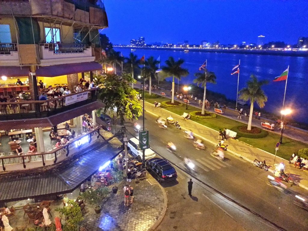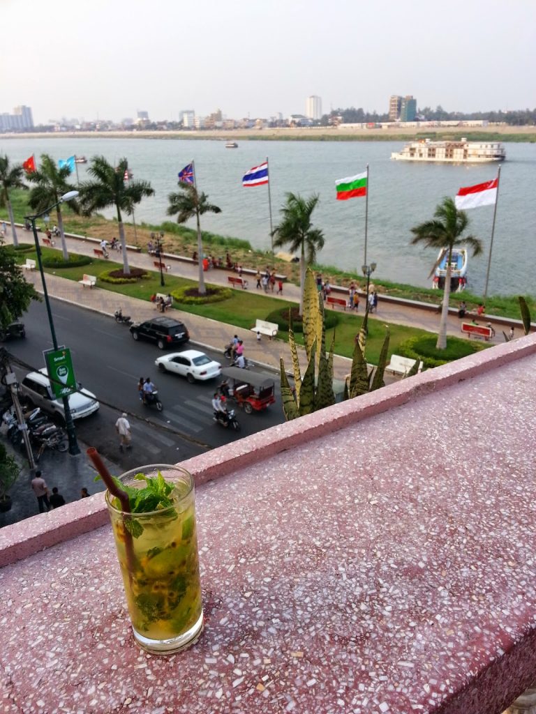 Im Foreign Correspondents‘ Club habe ich mich auf die Dachterrasse gesetzt und die Aussicht und die Happy Hour genossen. Nach einer Weile setze sich ein Paar neben mich und die Frau sprach mich sofort an, dass es sehr nett sei, dass ich „ihren“ Schal (gemeint war der typisch kambodschanische Krama) tragen würde.
