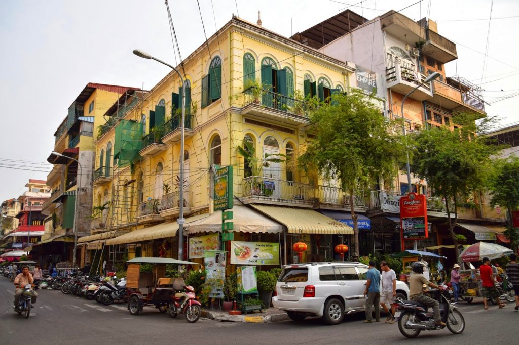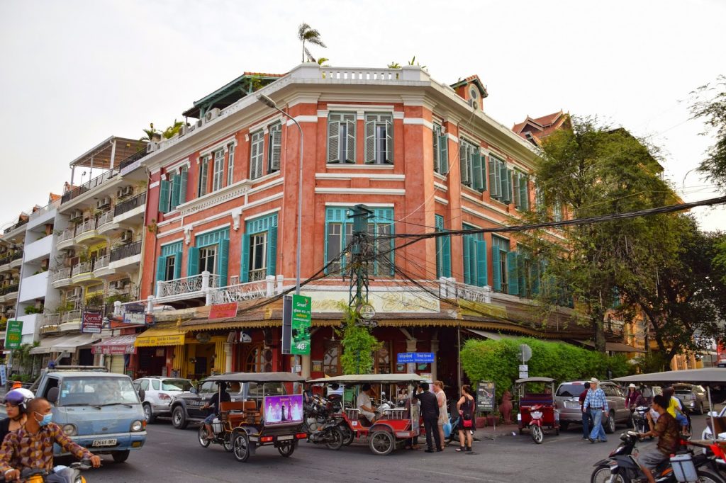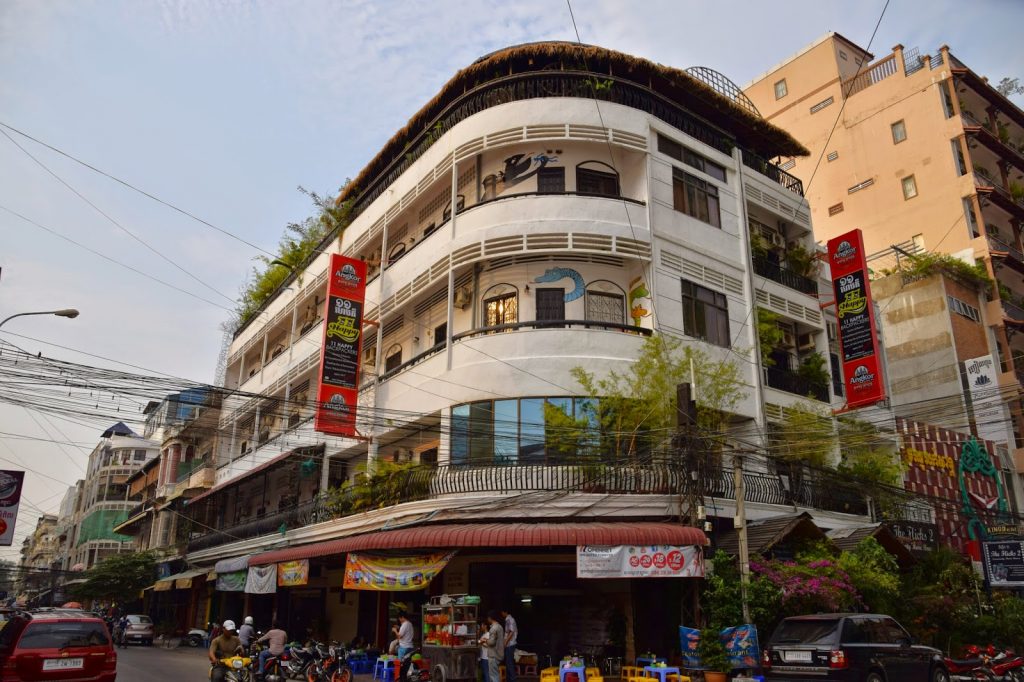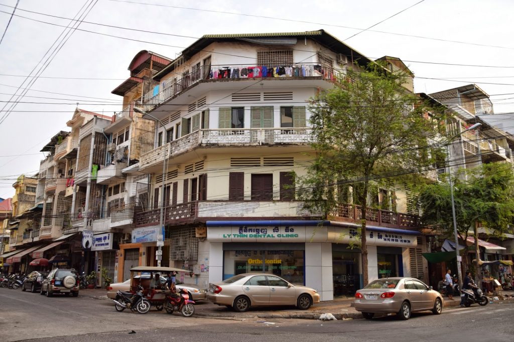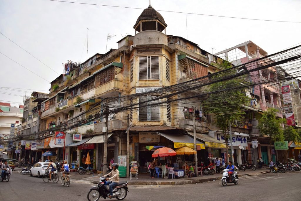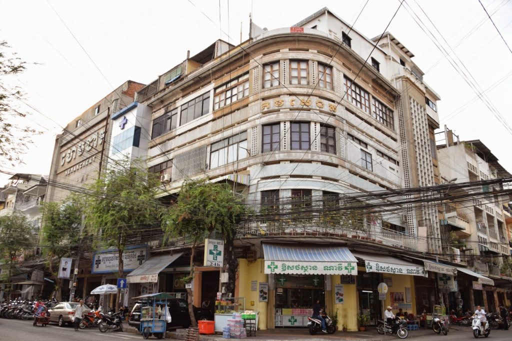 Das aus der Zeit zwischen 1900 und 1910 stammende Gebäude in dem früher das Hotel International untergebracht war, steht auf der ehemals belebtesten Einkaufsstraße Phnom Penhs. Das Schild „Hotel International“ ist noch zu erkennen.