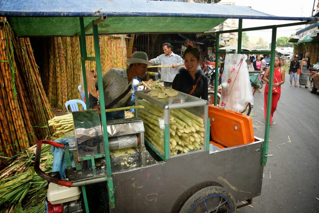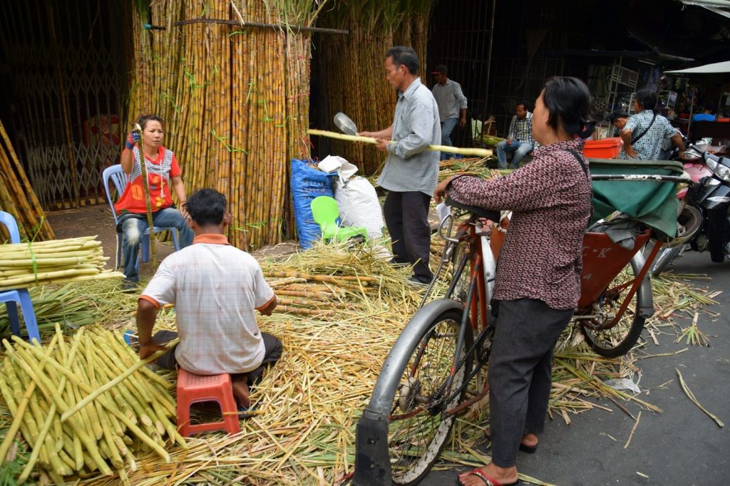 Kurz vor Ende meines Spaziergangs stand ich plötzlich auf einer Straße, auf der frische Palmzuckersaft verkauft wurde. Hier sieht man, wie die Rohre vorbereitet werden, bevor sie ausgepresst werden.