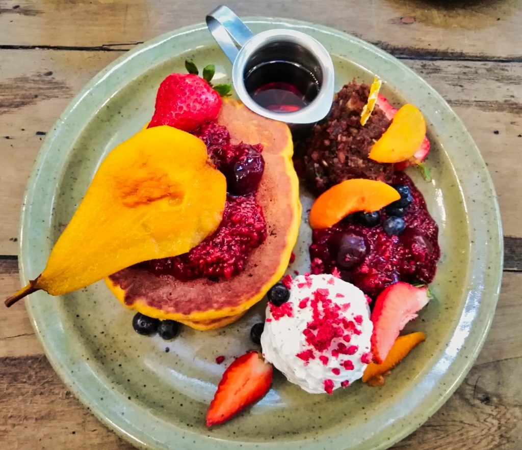 Ich habe mich dann für Buchweizen-Pfannkuchen mit karamellisierter Birne, Erdbeeren, Himbeere-Coulis und Kokosnuss-Schlagsahne entschieden. Mmmhhh – lecker.