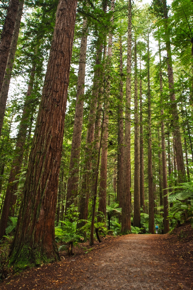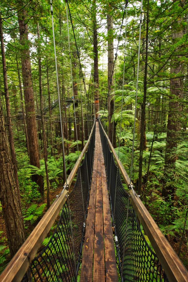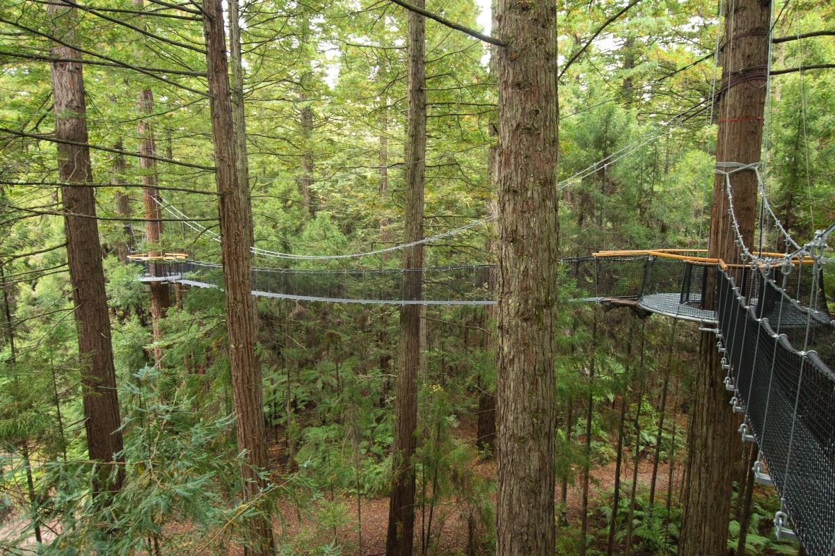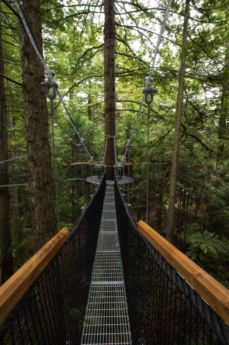 Bevor ich mich dann auf den Weg zum Tongariro Nationalpark gemacht habe, habe ich in Rotorua auch noch den Redwood Forest besucht und dort zunächst den Redwoods Treewalk gemacht. Dabei handelt es sich um eine Reihe von 23 Hängebrücken und 22 Plattformen, die in luftiger Höhe an und zwischen einigen Redwood-Bäumen angebracht sind. Die anfängliche Höhe beträgt 6 Meter, der höchste Punkt liegt bei 12 Metern. Die längste Hängebrücke ist 37 Meter lang, die Gesamtlänge des Treewalk beträgt 553 Meter. Gebaut wurde der Treewalk mit Hilfe von eigens aus Deutschland eingeflogenen Spezialisten.