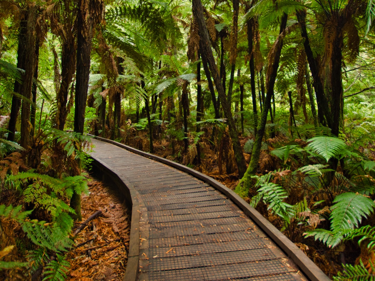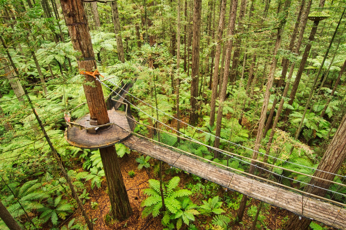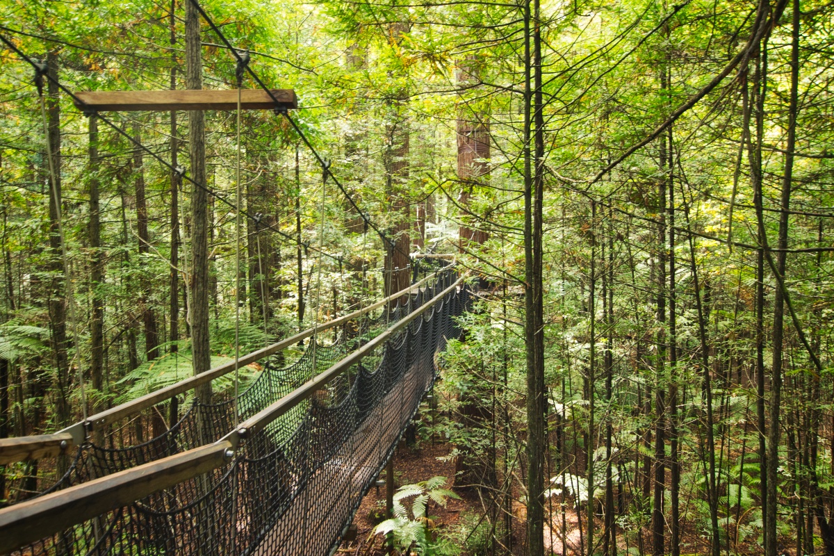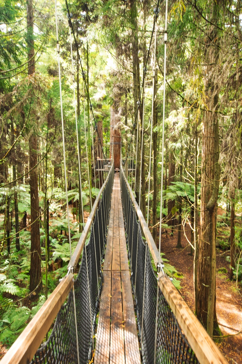 Bevor ich mich dann auf den Weg zum Tongariro Nationalpark gemacht habe, habe ich in Rotorua auch noch den Redwood Forest besucht und dort zunächst den Redwoods Treewalk gemacht. Dabei handelt es sich um eine Reihe von 23 Hängebrücken und 22 Plattformen, die in luftiger Höhe an und zwischen einigen Redwood-Bäumen angebracht sind. Die anfängliche Höhe beträgt 6 Meter, der höchste Punkt liegt bei 12 Metern. Die längste Hängebrücke ist 37 Meter lang, die Gesamtlänge des Treewalk beträgt 553 Meter. Gebaut wurde der Treewalk mit Hilfe von eigens aus Deutschland eingeflogenen Spezialisten.