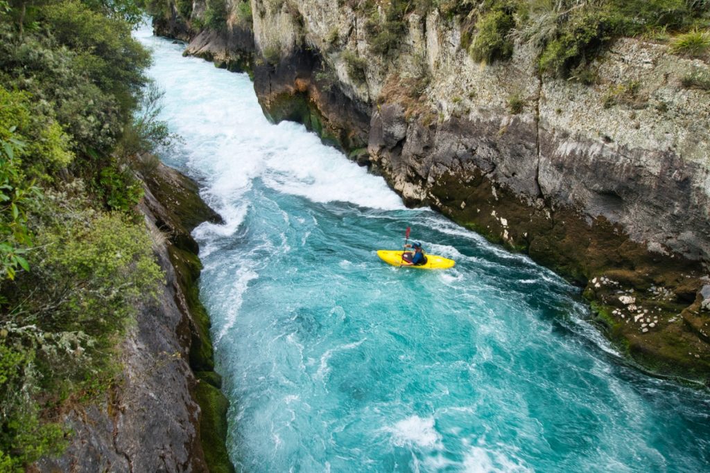 Die Huka Falls sind schon sehr spektakulär. Sie sind zwar nicht besonders hoch, aber zu sehen, wie das Wasser des Waikato River durch die enge Schlucht schießt, ist schon ein Erlebnis. Insbesondere, wenn man dann auch noch Kajak-Fahrern dabei zusehen kann, wie sie durch die Schlucht rasen.