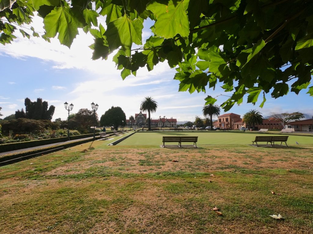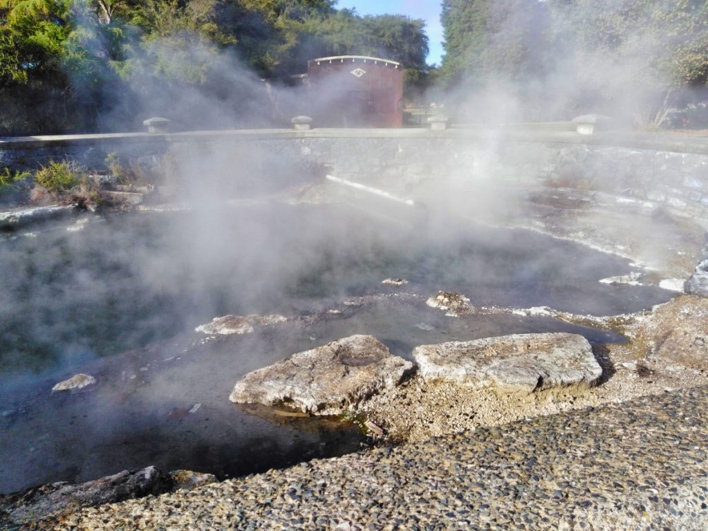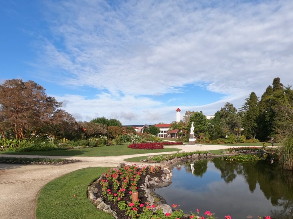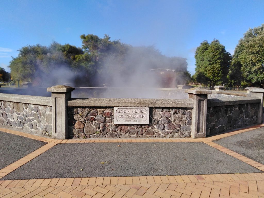 An meinem letzten Morgen in Rotorua habe ich ganz früh noch einen Spaziergang zu den Government Gardens gemacht. Dort gibt es neben den sehr schönen Gärten auch noch die Rachel Spring zu sehen. Sie ist ein Beispiel für die geothermische Aktivität mitten im Stadtzentrum von Rotorua.