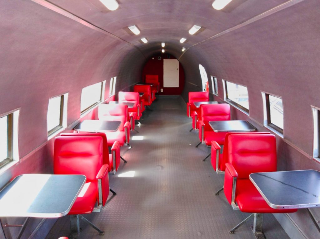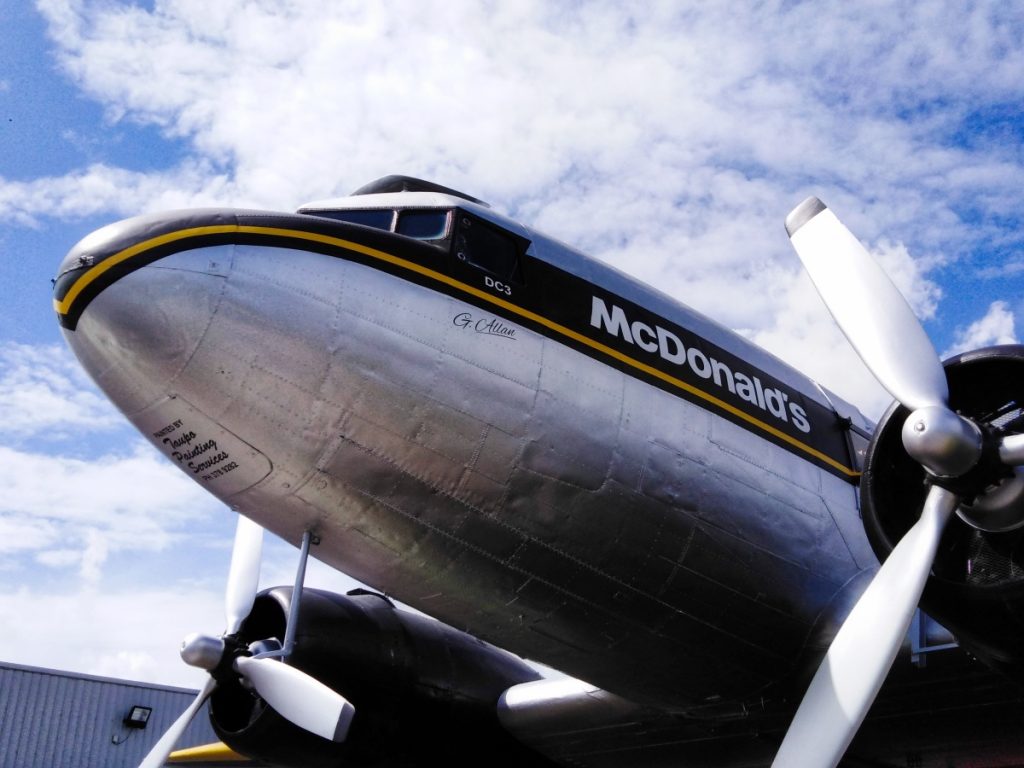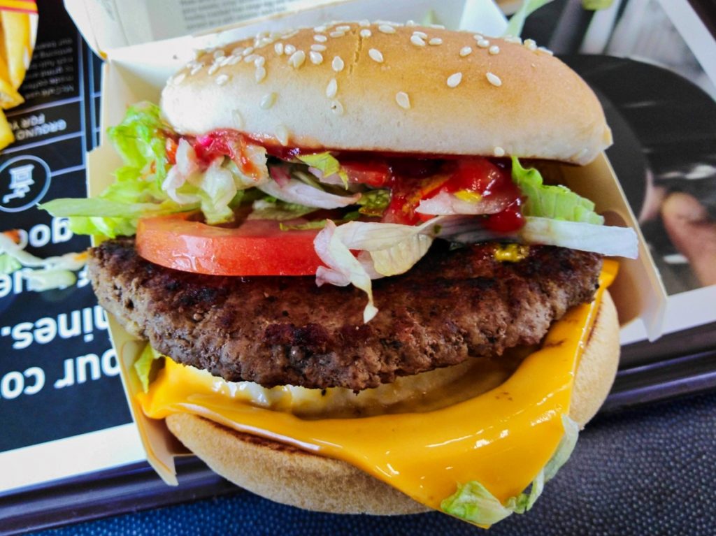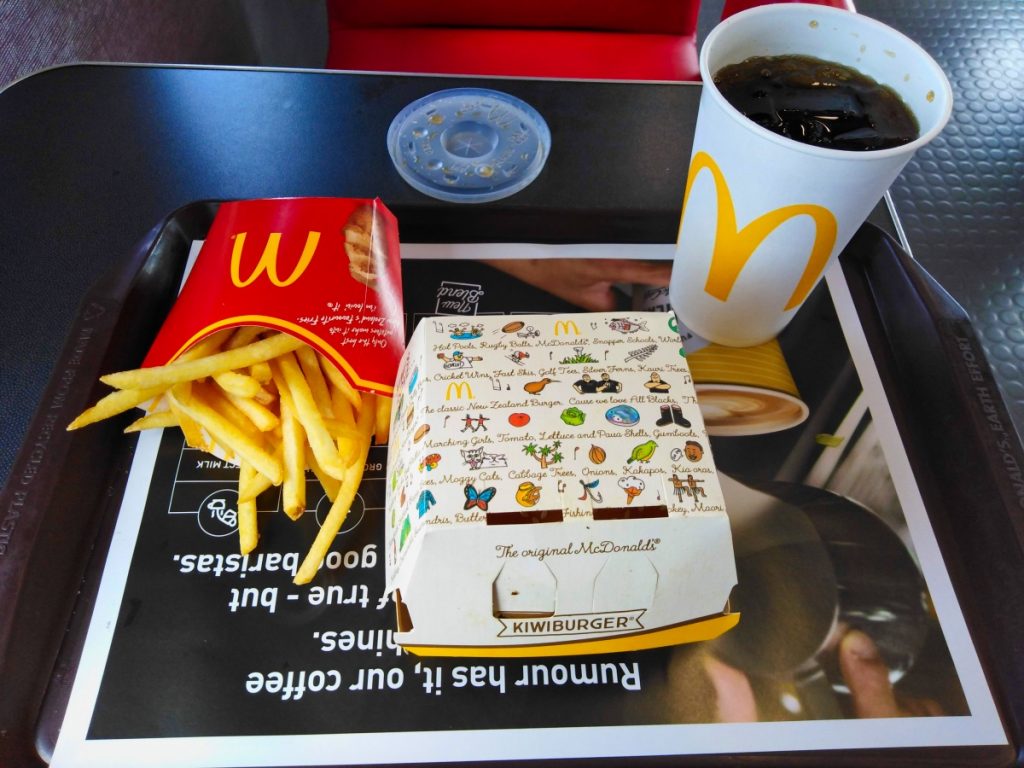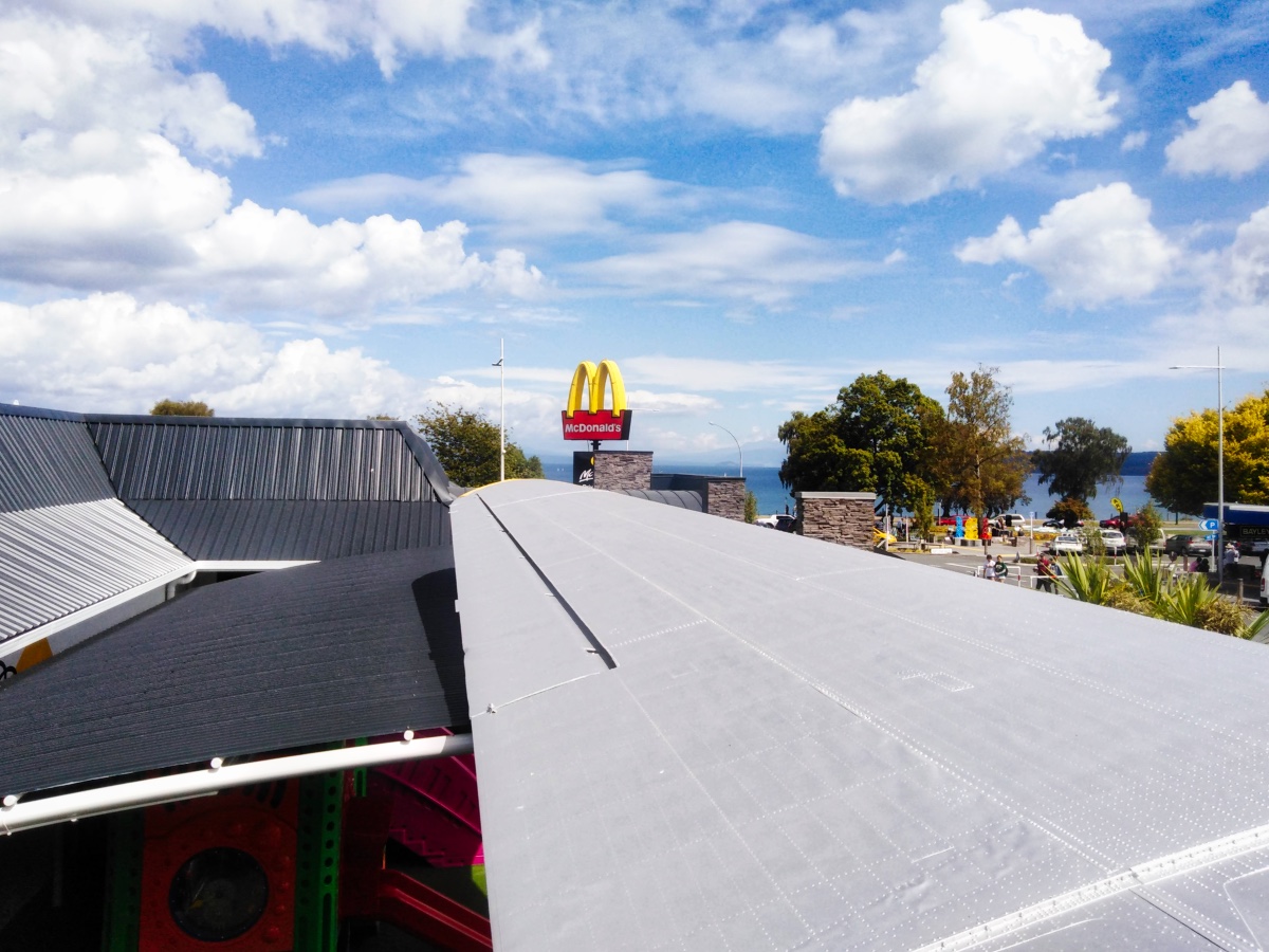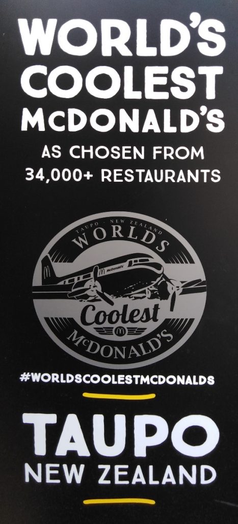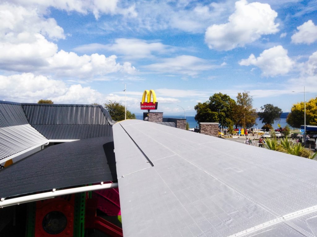 Während der Fahrt – es war mittlerweile schon Mittag – habe ich mir überlegt, dass ich in Taupo auch gleich noch Essen gehen könnte – und zwar bei McDonald’s. Jetzt mag man sich fragen, warum man in Neuseeland bei McDonald’s essen geht, aber der McDonald’s in Taupo ist wirklich etwas besonderes. Denn zum McDonald’s gehört eine alte DC-3, in der man sogar sitzen und essen kann! Und wenn schon McDonald’s, dann auch richtig – mit einem Kiwi Burger. Das ist eine neuseeländische Spezialität von McDonald’s – ein Beef Burger mit Roter Beete und Spiegelei. Lecker, aber ziemlich schwierig zu essen.