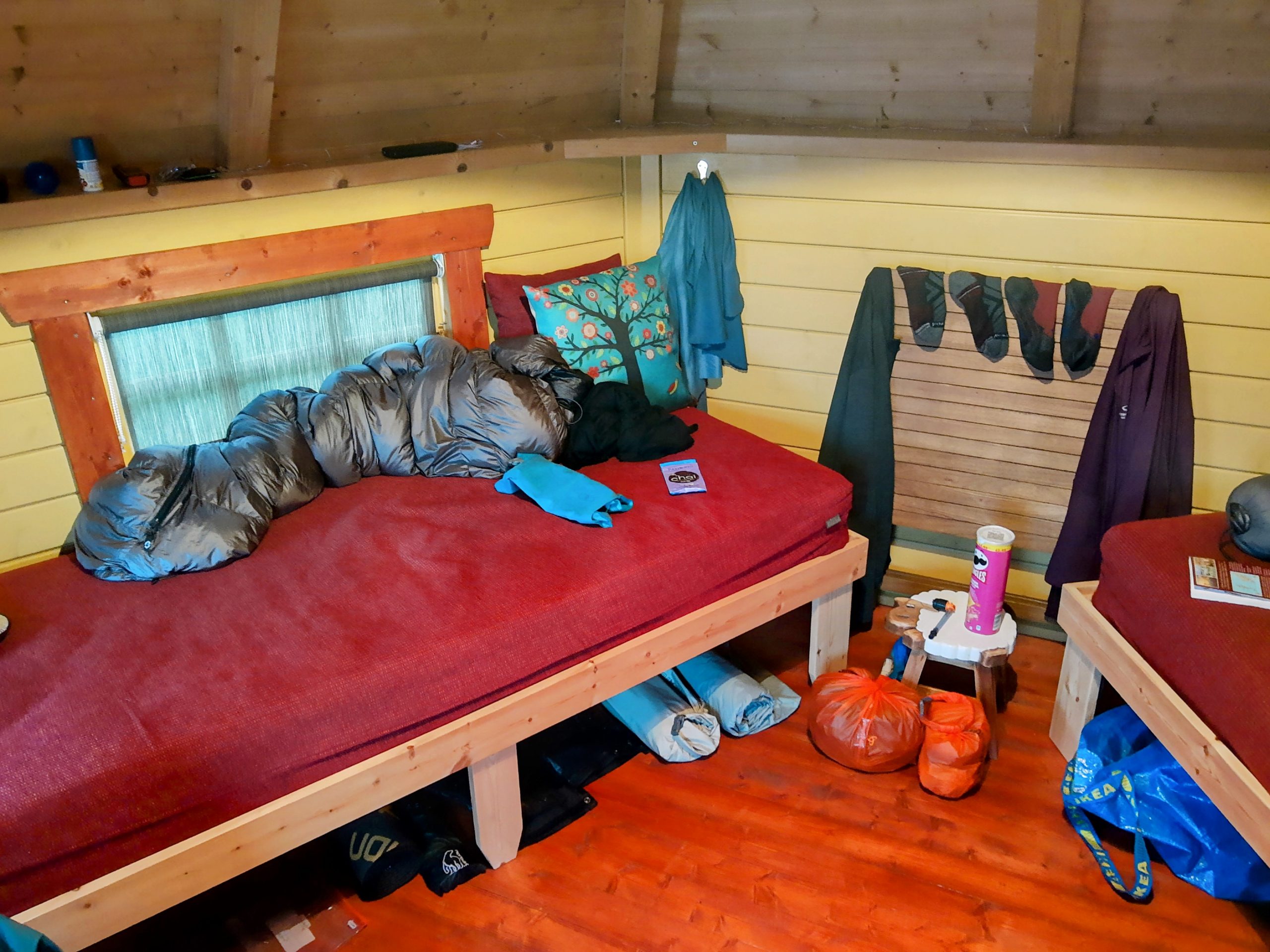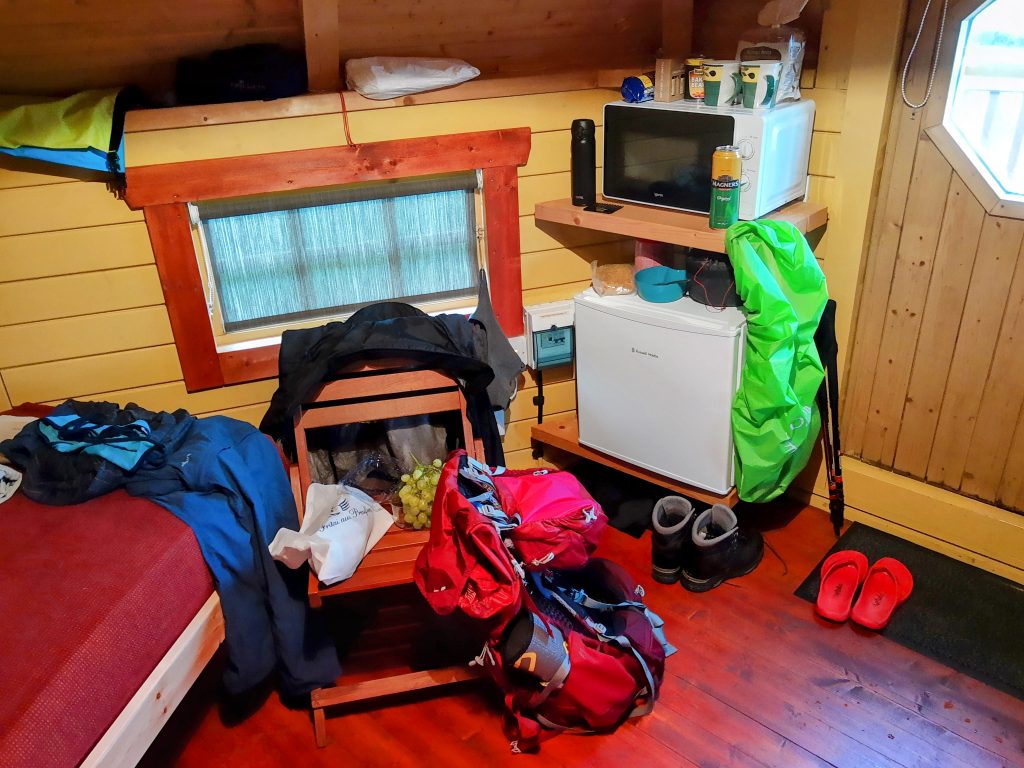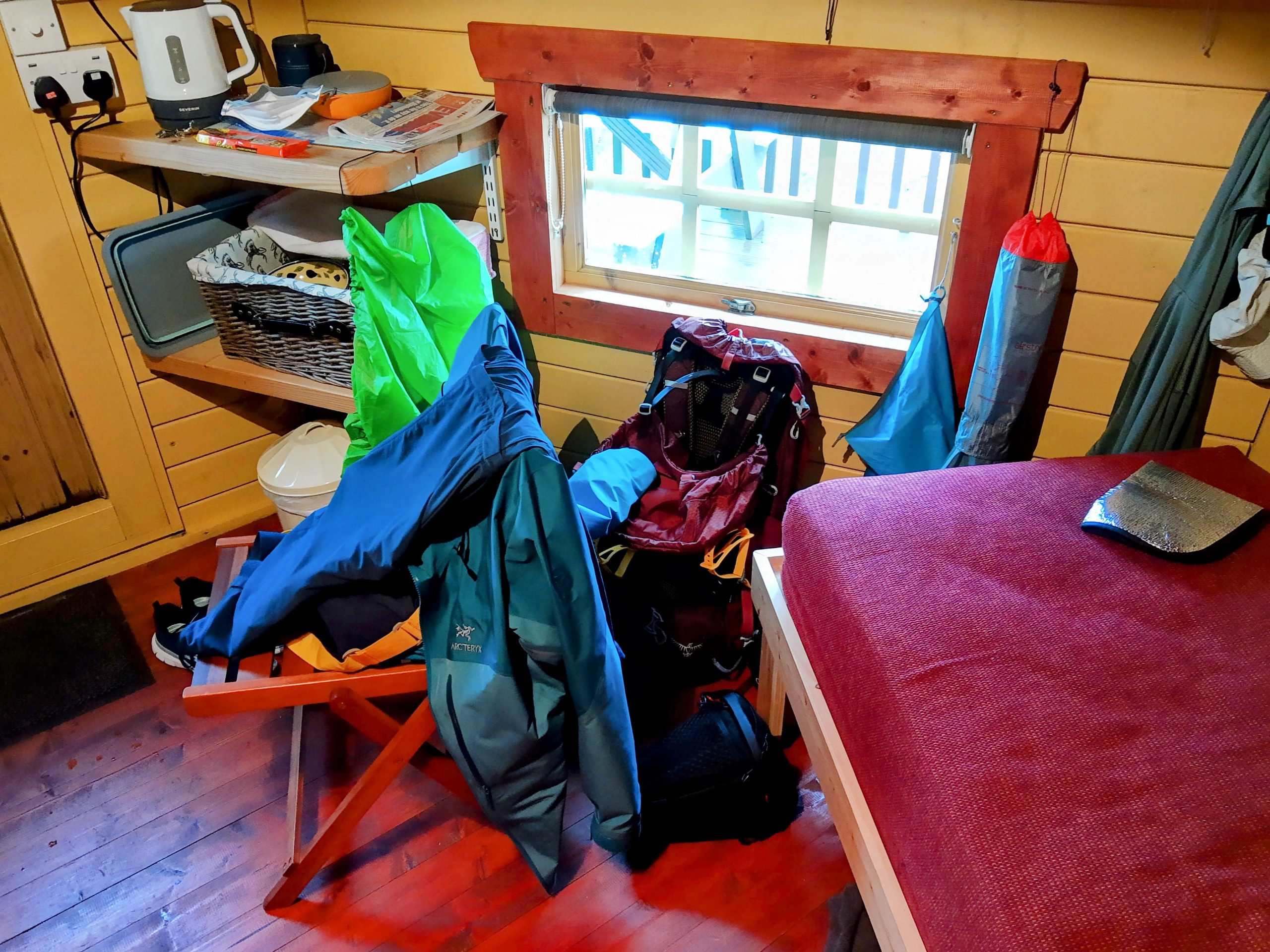 In unserem Glamping Pod hatten wir alle unsere Sachen ausgepackt und verteilt, um sie zu trocknen. Denn es war so ziemlich alles nass geworden.