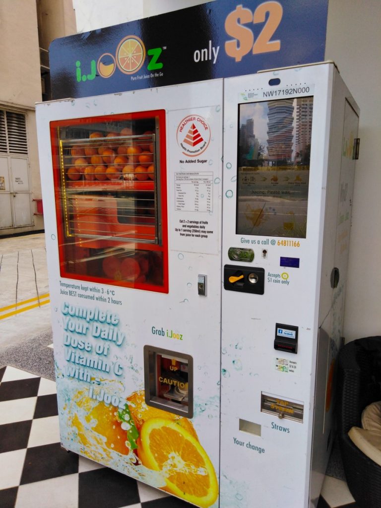 Vom Tekka Centre bin ich zurück zu meinem Hotel gelaufen, um meinen Koffer abzuholen. Da ich recht früh dran war, habe ich das WiFi dort noch für einen Anruf zuhause genutzt und habe mir am Automaten einen frisch gepressten Orangensaft gezogen. Der Automat ist mit Orangen befüllt und der Saft wird tatsächlich im Automaten frisch gepresst. So etwas sollte es bei uns auch mal geben. Und das Ganze für 2 SGD, d.h. 1,30 Euro.