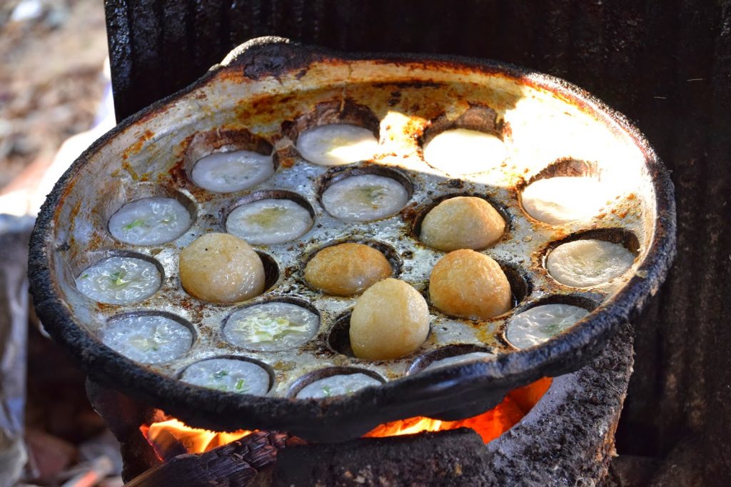 Die „Klöße“ wurden in einer Art „Poffertjes-Pfanne“ über dem offenen Feuer gegart. Innen drin waren sie noch ganz weich. Nicht schlecht, aber auch nicht wirklich mein Favorit.