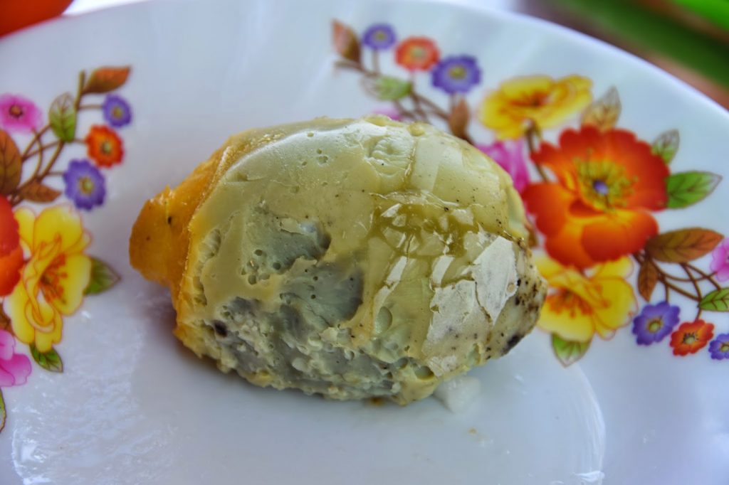 Die Eier werden so zubereitet, dass zunächst ein kleines Loch in die Schale gemacht wird und das Eiweiss und Eigelb herausgeholt wird. Dann wird beides mit Gewürzen vermischt und anschließend wird die Mischung wieder in die Eierschale zurückgefüllt. Abschließend wird das ganze gegart – das Endresultat ist eine Art in der Schale gegartes Rührei. Schon besser als der vorherige Snack.