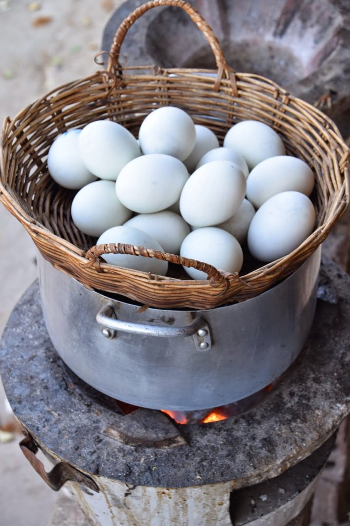 Ich habe aber in diesem Zusammenhang so einiges gelernt. Weiße Eier sind in Kambodscha in der Regel Enteneier – braune hingegen Hühnereier. Wenn man so einen Korb …
