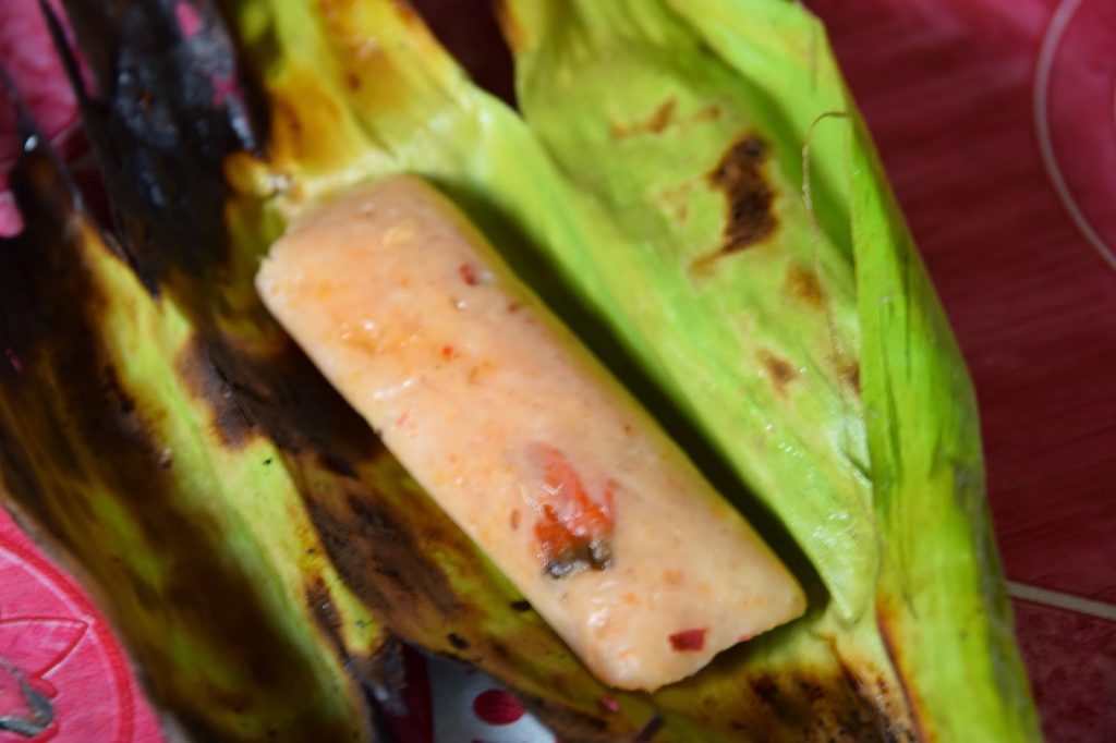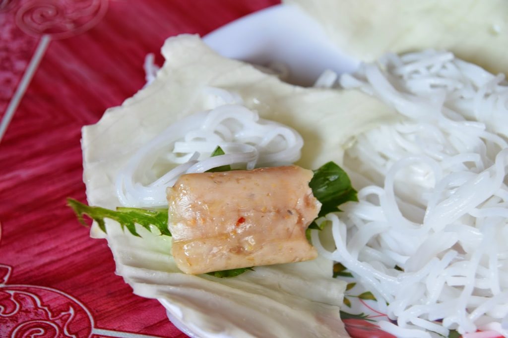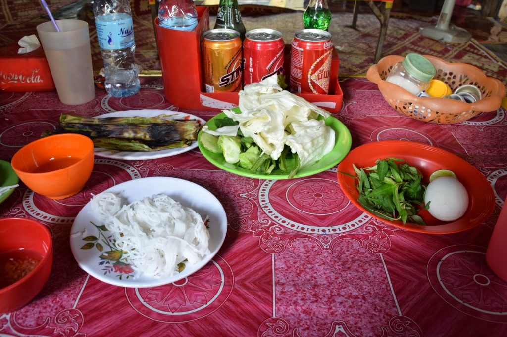Bei dem Fisch musste man aufpassen, denn es handelte sich nicht um ganze Fischstücke, sondern eher um eine Art gedünsteten Fischcake, d.h. der Fisch war zerkleinert und mit Gewürzen zu einer Paste vermengt worden. Neben den Gewürzen wurden aber auch recht große Stücke Chilischote eingearbeitet. Die habe ich auf Empfehlung meines Guides vorsichtig rausgeholt, bevor ich meine Frühlingsrollen gerollt habe.