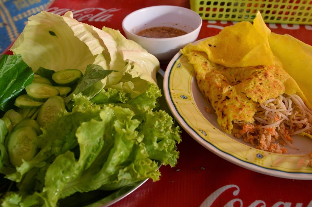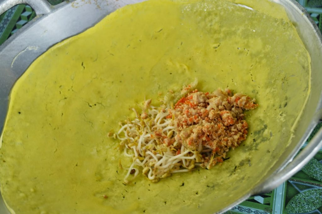 Beim dritten Stop gab es eine Art Crepe aus Ei, Reismehl und Kokusnussmilch, die mit Sojasprossen und Hackfleisch gefüllt wurde. Dazu bekam man wieder eine großen Teller mit Salatblättern und Kräutern sowie einer Sauce zum Dippen und konnte sich wieder eine Art Frühlingsrolle rollen.