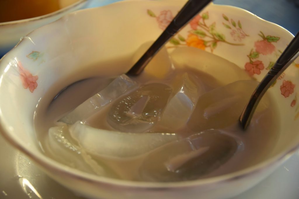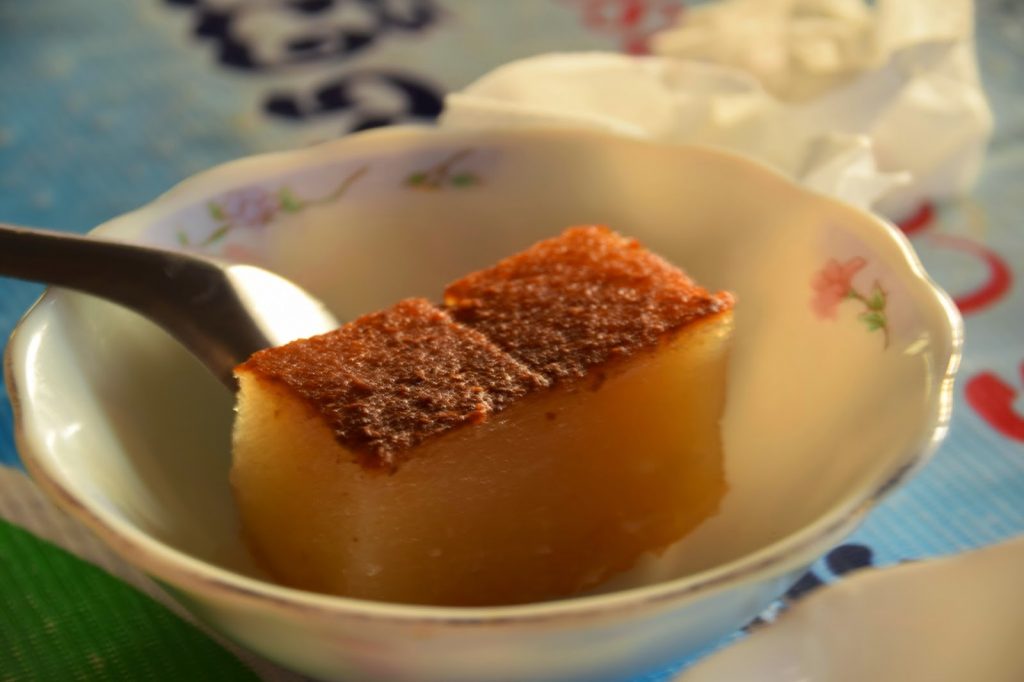 Beim letzten Stopp gab’s dann Nachtisch. Zum einen „Palm Fruit“ und zum anderen eine Art süßen Klebreiskuchen mit Kokusnussgeschmack. Beides sehr, sehr lecker.