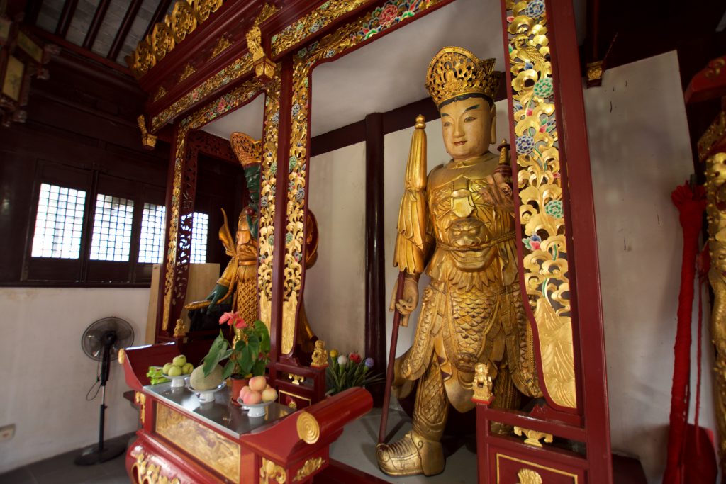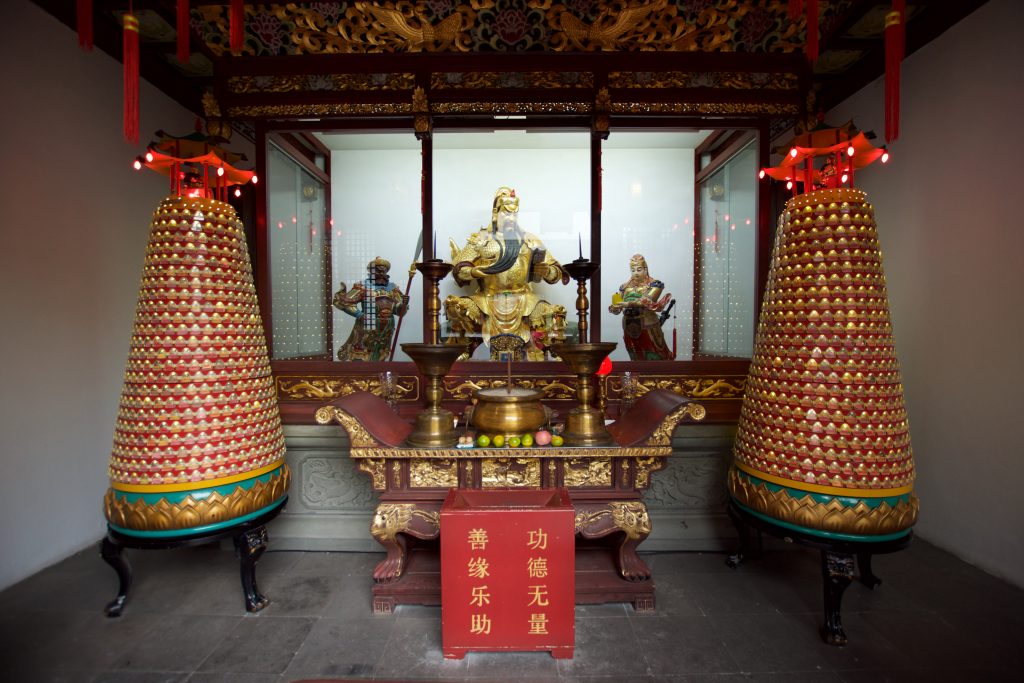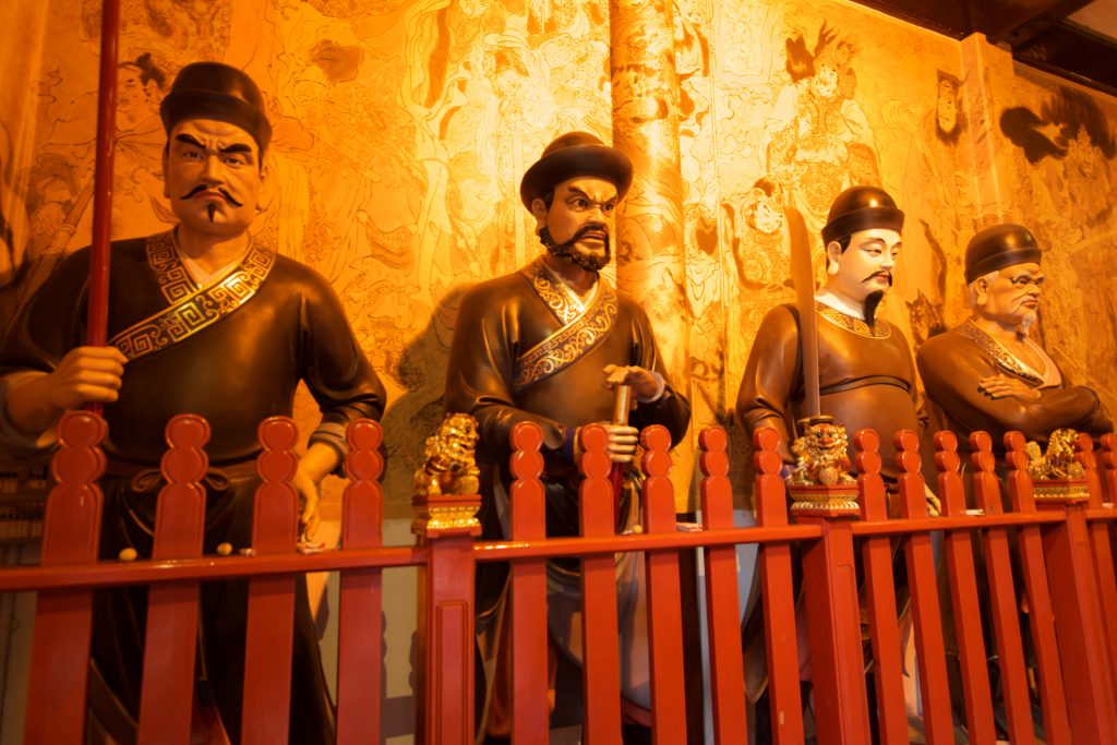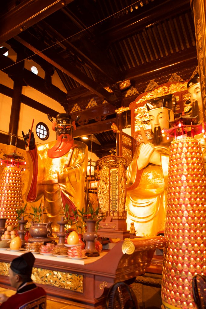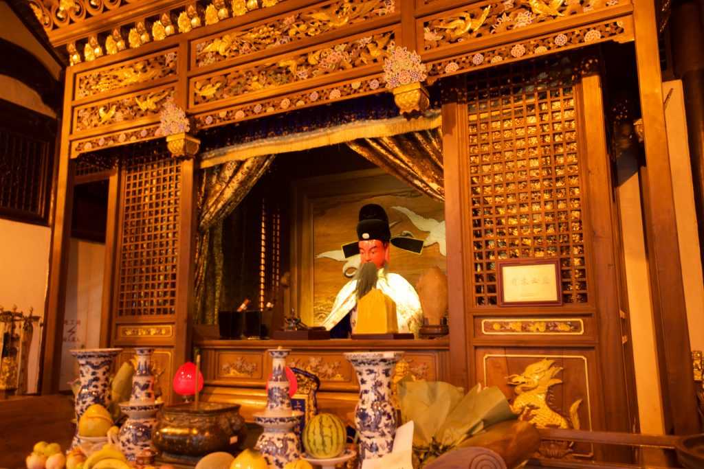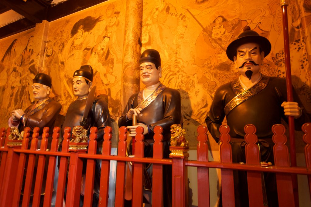 Rechts und links der Statue von Huo Guang stehen zwei „Assistenten“. Der eine – mit dem weißen Gesicht – notiert alle guten Dinge, die die Menschen getan haben, und der andere – mit dem schwarzen Gesicht (hier links im Bild oben) – notiert alle schlechten Dinge, die die Menschen getan haben. Auf jeder Seite der Halle stehen jeweils vier Statuen von Offizieren. Zwei notieren Informationen und Bitten, zwei geben die Informationen weiter, zwei leiten sie an den Stadtgott weiter und zwei beschäftigen sich mit den Antworten. So jedenfalls die englischsprachigen Erläuterungen.