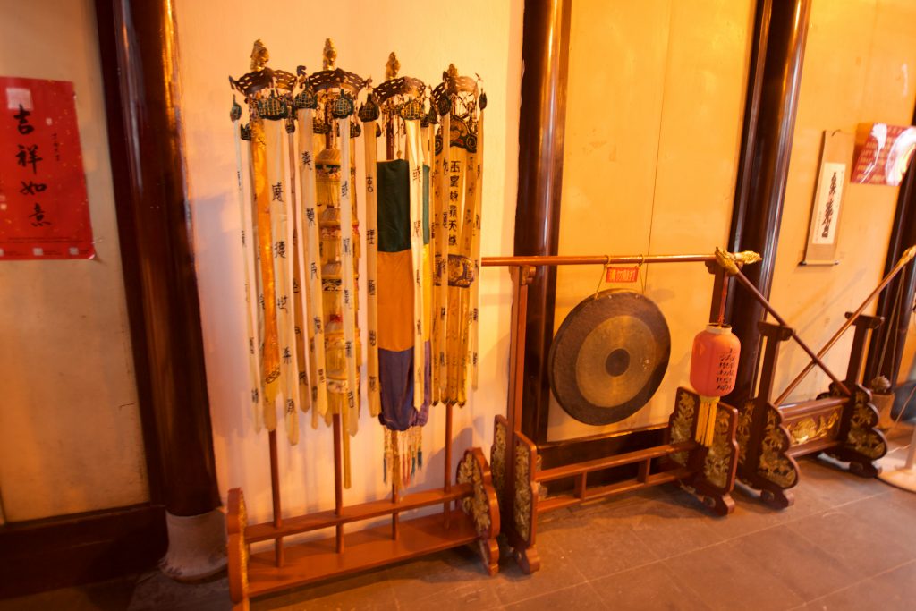 In der hinteren Halle steht die Statue des rotgesichtigen Stadtgottes Qin Yubo. Er wurde in der Ming-Zeit zur Gottheit ernannt und trägt daher die Kleidung eines Beamten der Ming-Dynastie. Rechts und links an der Wand der Halle stehen Gongs, Laternen und Flaggen. Diese werden bei Prozessionen des Stadtgottes benutzt.