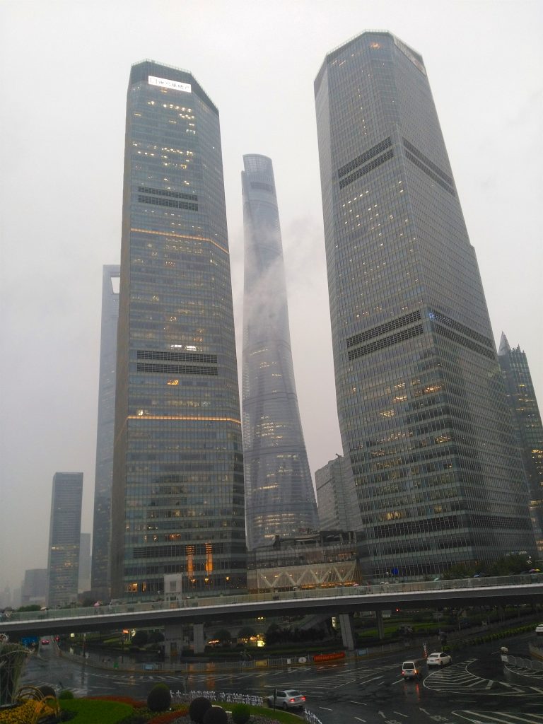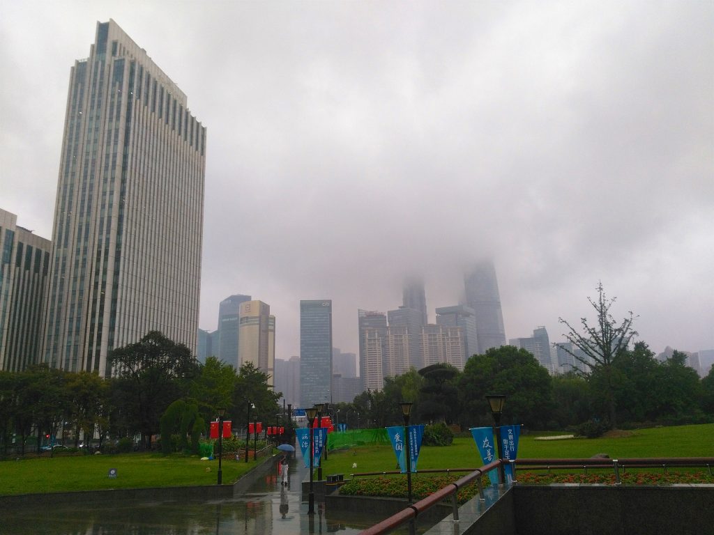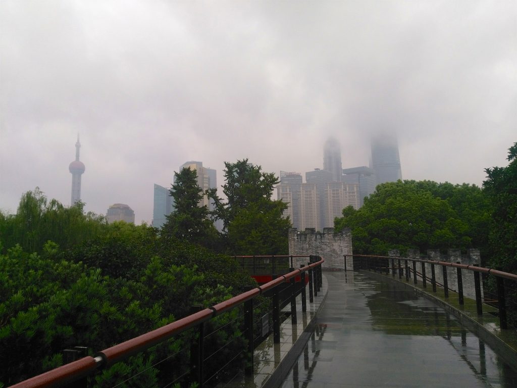 Am Ende der Tour war ich angesichts der Regens etwas unschlüssig, was ich mit dem Rest des Tages machen sollte. Ich entschied mich, erstmal wieder Richtung Hotel zu laufen. Auf dem Weg kam ich noch durch den Gucheng Park. Von hier hat man eigentlich einen guten Blick auf die Hochhäuser von Pudong, aber an diesem Tag konnte man die Spitzen der Hochhäuser überhaupt nicht sehen.