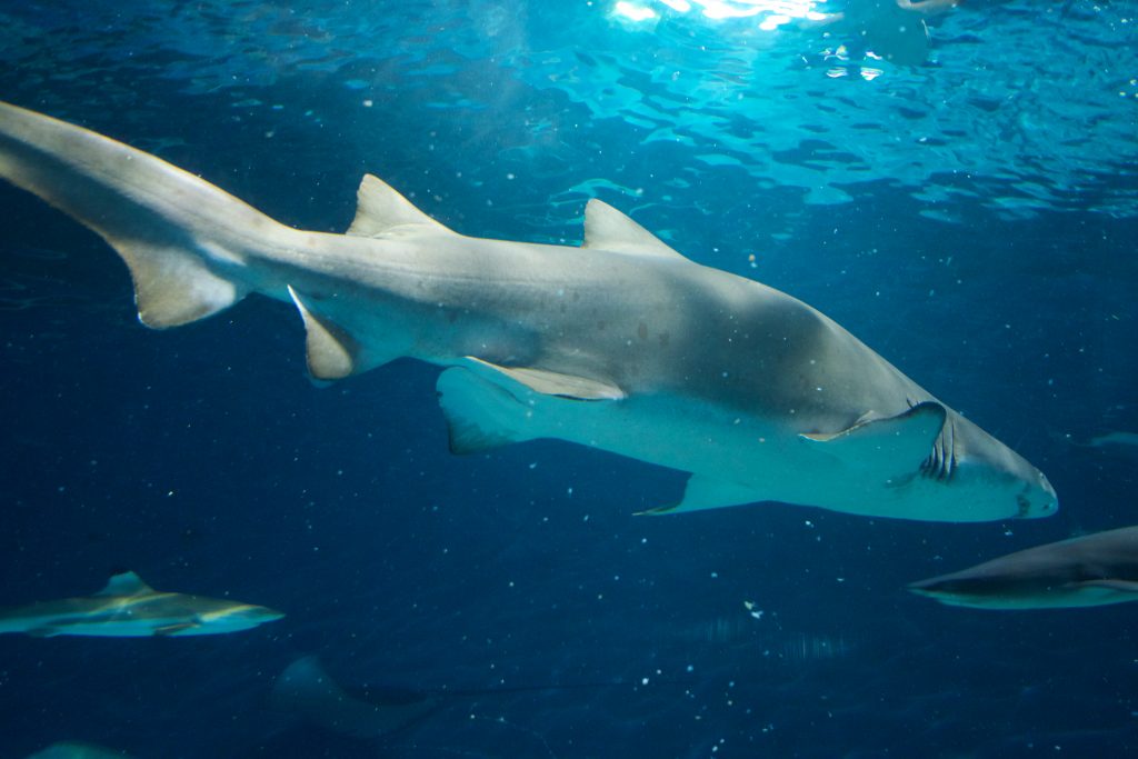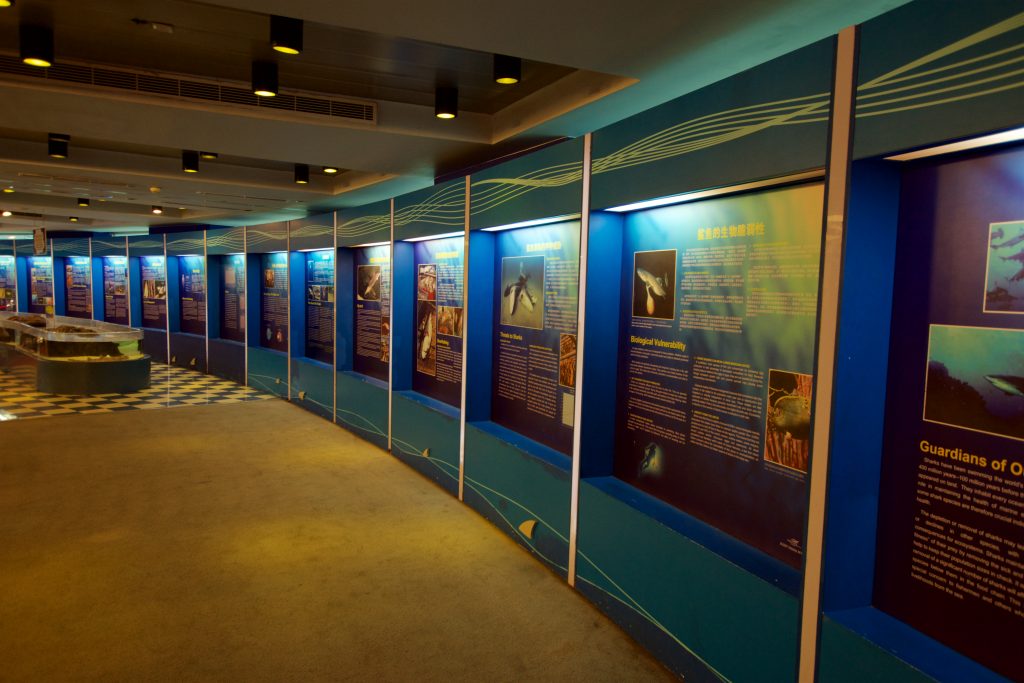 Das Shanghai Ocean Aquarium ist vor allem für seinen 155m langen Glastunnel einen Besuch wert. Aber dieser kommt erst ganz am Ende der als Einbahnstraße konzipierten Ausstellung. Zunächst fährt man in den obersten Stock. Dort gibt es u.a. eine Ausstellung über die Bedrohung der Hai durch die Fischerei. Diese Ausstellung war nicht besonders ansprechend gestaltet, dafür aber umso informativer. Ich fand es interessant, wie selbstkritisch mit dem Thema Konsum von Haifischflossenfleisch umgegangen wurde. Allerdings meine ich, dass noch mehr getan werden könnte, denn ein Großteil der Importe kommt wohl über Hongkong ins Land und da könnte man m.E. noch genauer hinsehen, was das importiert wird