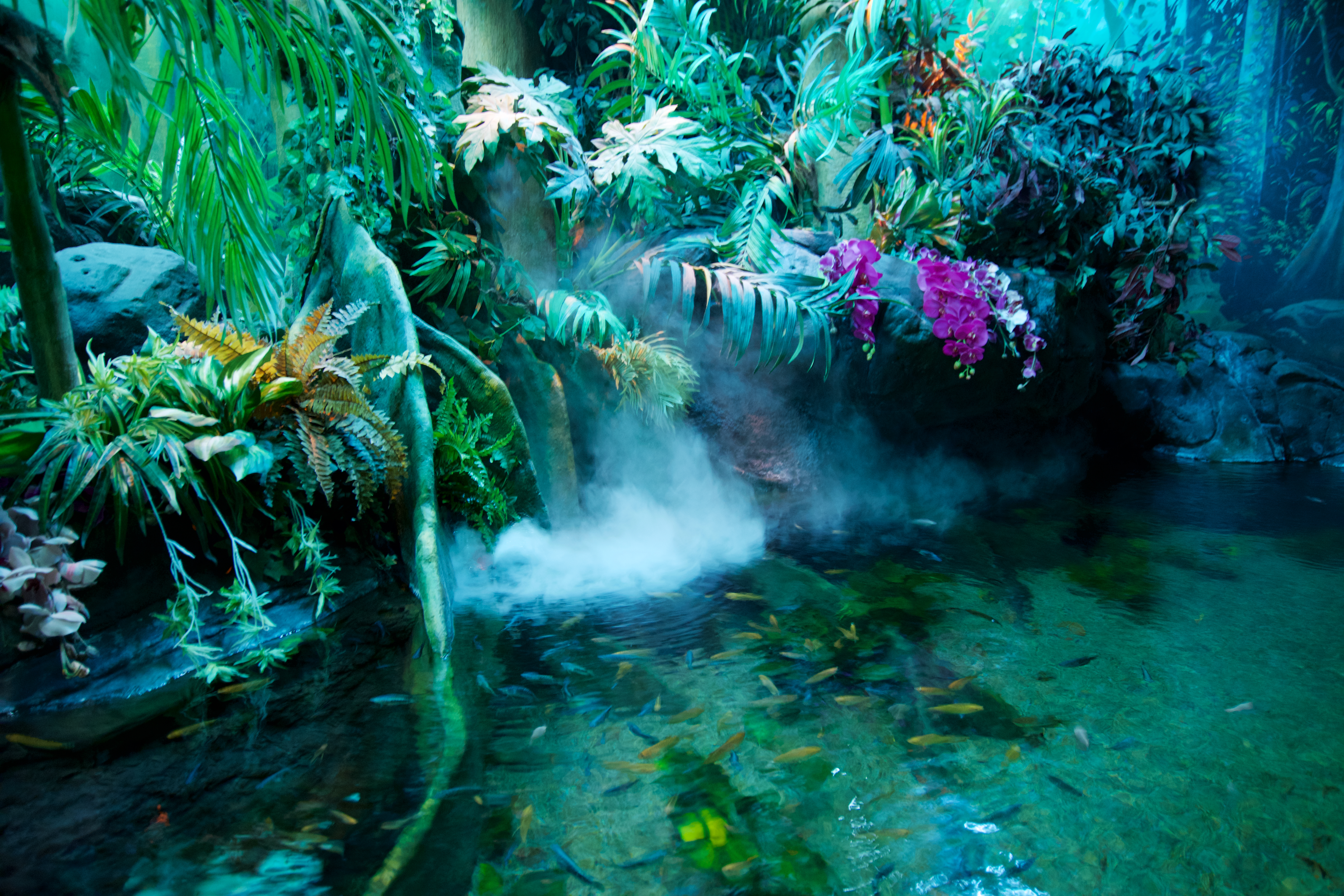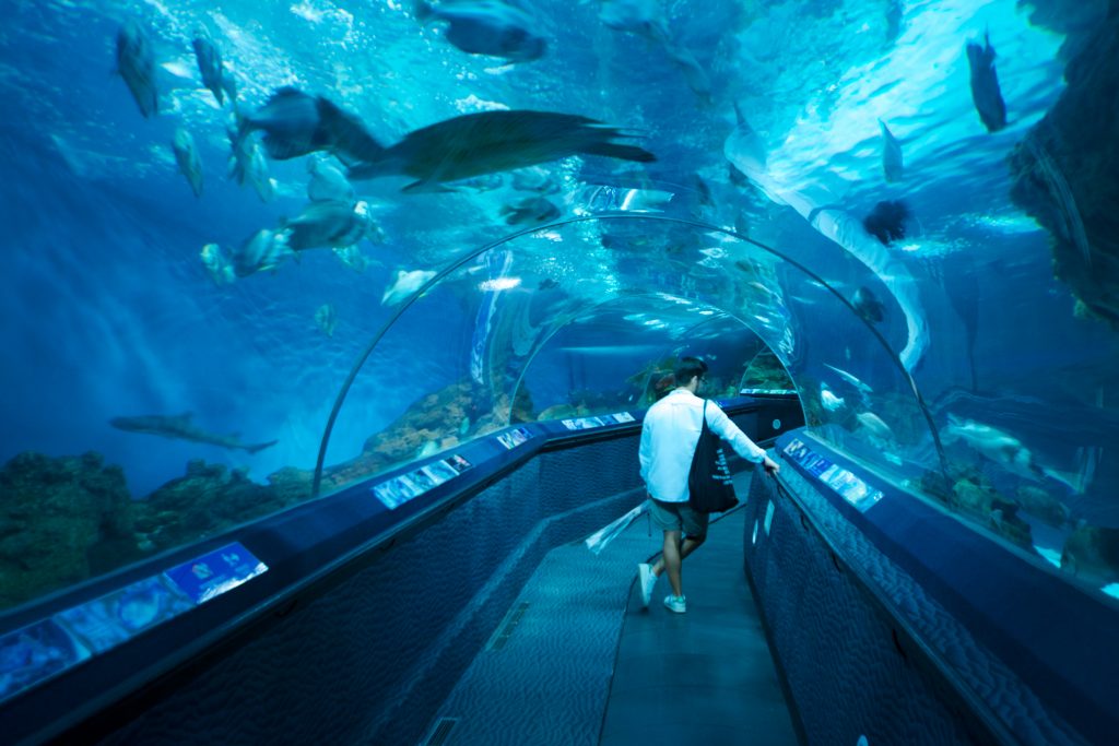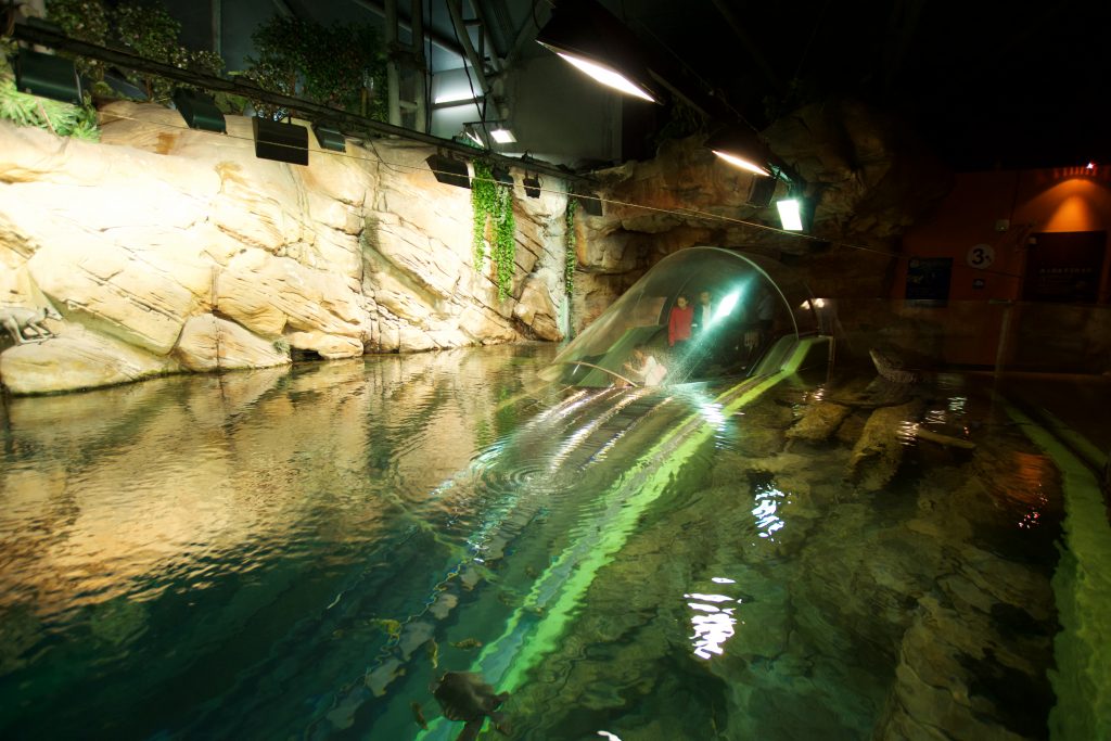 Ein echter Hingucker war die Rolltreppe, die eine Etage tiefer führte – sie lief in einem Glastunnel durch eines der Wasserbecken.