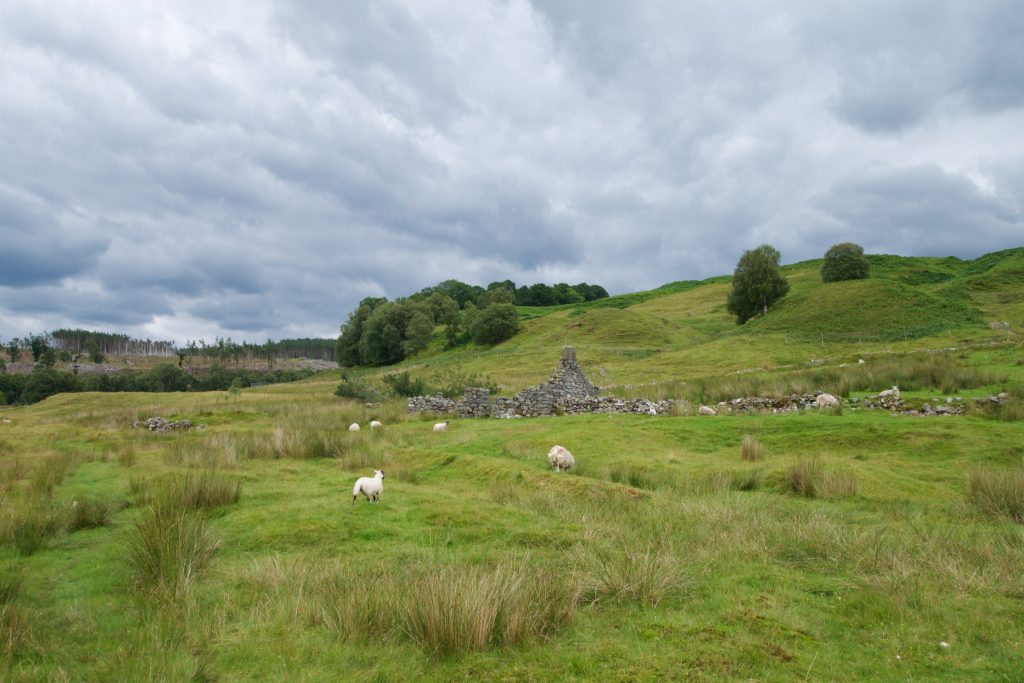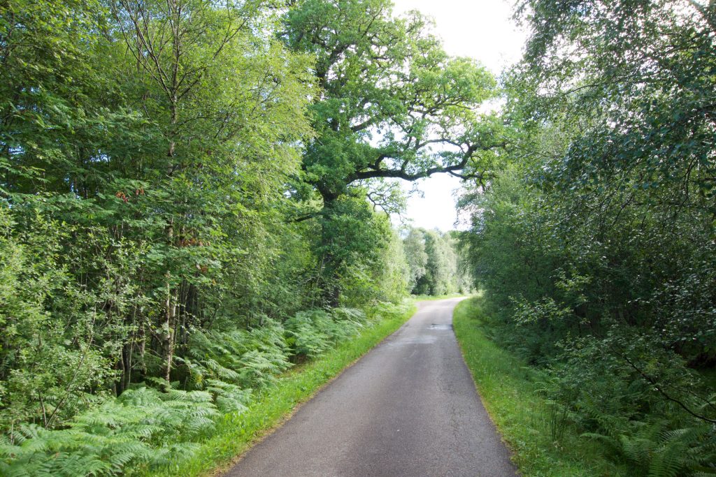 Das allerletzte Stück des Weges ging dann allerdings wieder durch intakten Wald. Kurz vor der Abzweigung nach Inverlair habe ich Colin, den Inhaber des Riverside Lodge B&B in Spean Bridge angerufen, der uns in Inverlair einsammeln sollte. Wir hatten zwar ausgemacht, dass wir anrufen würden, kurz bevor wir da sind, aber da wir länger gebraucht hatten als seine letzten Gäste und er auch in Erinnerung hatte, dass er uns um 16 Uhr einsammeln sollte, war er schon da, als ich um kurz nach 16 Uhr anrief. Um ihn nicht noch unnötig länger warten zu lassen, sind wir das Stückchen hinunter nach Inverlair relativ schnellen Schrittes gegangen.