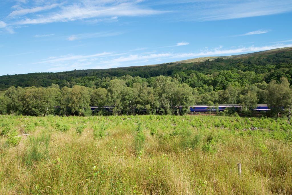 Als wir wieder aus dem Wald herauskamen, bot sich uns ein dramatischer Ausblick auf die Hügel südlich des Weges. Einige Meter den Hang hinauf konnte man die Überreste einer alten Eisenbahnlinie sehen.