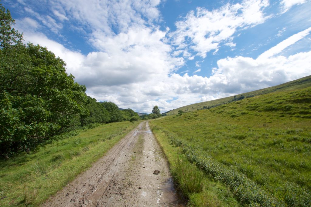Unser Weg führte also zunächst auf der Nebenstraße entlang. Die Straße verlief im- mer parallel zum River Spean durch den Wald. Nach einigen Kilometern ging die asphaltierte Straße in einen Schotterweg über und der Wald lichtete sich.