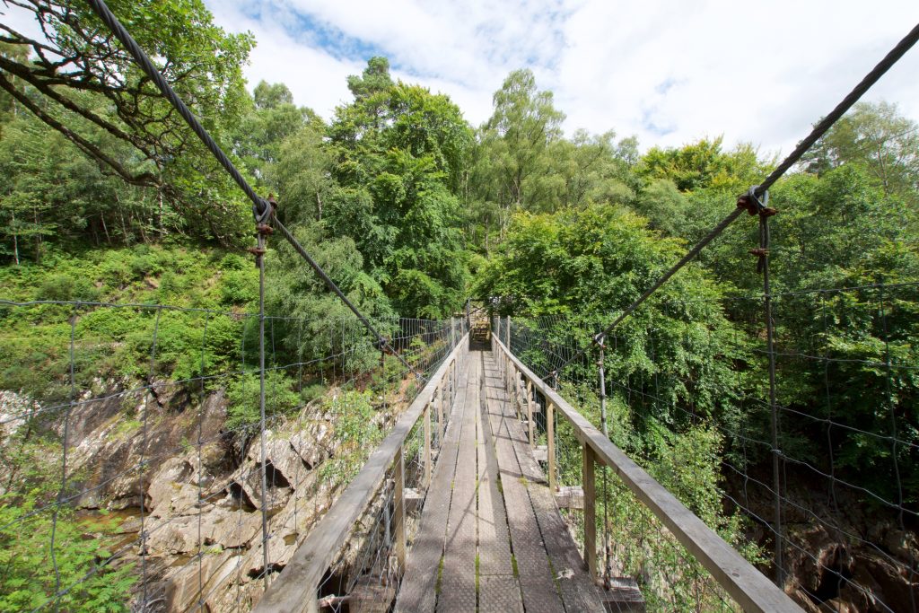 Nachdem wir das Gelände einer Farm passiert hatten (sehr matschig), kamen wir wenig später zu einer Abzweigung, an der der East Highland Way rechts weiter ging und links ein schmaler Trampelpfad den Hügel hinunter führte. Ausweislich des Guidebooks began hier ein Abstecher zu Cille Choirill Church in Monessie. Da wir noch ganz gut in der Zeit lagen und das Guidebook den fantastischen Ausblick von der Kirche aus anpries, nahmen wir den kleinen Trampelpfad bergab. Zunächst kamen wir an einer Hängebrücke vorbei, die beim Überqueren ganz ordentlich schwankte und auch nur für zwei Personen gleichzeitig ausgelegt war.