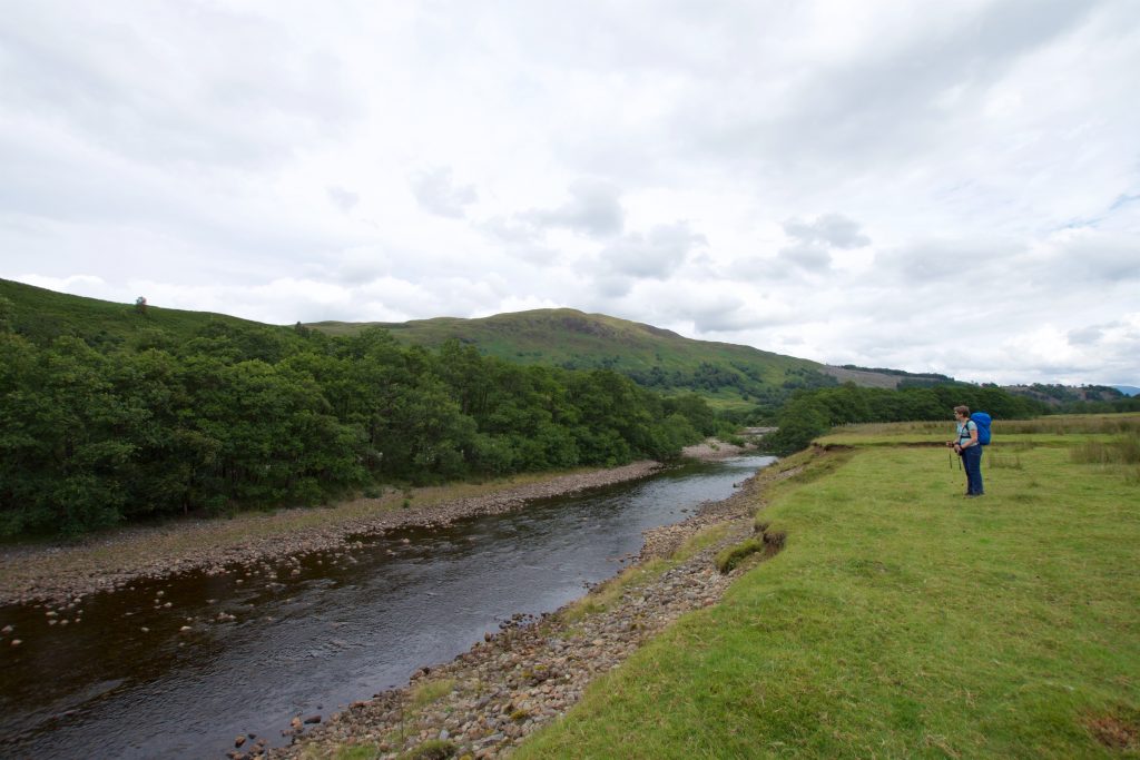 Danach wurde es aber wieder sehr abenteuerlich. Im Guidebook stand: „After passing the ruins you approach a gated field, make your way down a slight embankment to your left towards the river passing through some trees.“ Hier den Weg zu finden war wirklich schwierig und es war wieder die App, die uns darin bestärkt hat, dass wir weiterhin auf dem richtigen Weg waren. Nachdem wir die Böschung hinunter geklettert waren und in dem sich anschließenden kleinen Wäldchen einen Bachlauf überquert hatten, kamen wir wieder in offenes Gelände am Fluß. Der Weg war mehr oder weniger gut zu erkennen. Zumindest war zu erkennen, dass hier auch schon andere Leute vor uns lang gelaufen waren. Also mehr ein kleiner Trampelpfad als ein Weg. Da die Wolken mittlerweile immer dunkler wurden, ha- ben wir die Gelegenheit genutzt unter einem größeren Baum eine Rast zu machen, unsere Regenkleidung anzuziehen und die Kameras wegzupacken.