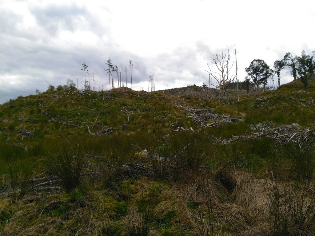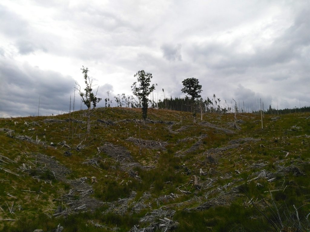 Das letzte Stück der Etappe sollte durch ein größeres Waldgebiet gehen und so war auch die Beschreibung im Guidebook. Nur leider war der Wald in der Zwischenzeit abgeholzt worden und so war es wieder nicht so ganz leicht den richtigen Weg zu finden. Der Anblick des abgeholzten Waldes war auch nicht beson- ders schön. Da wir die Kameras wegen dem drohenden Regen weggepackt hatten, konnten wir auch nur einige schnelle Bilder mit dem Handy machen.