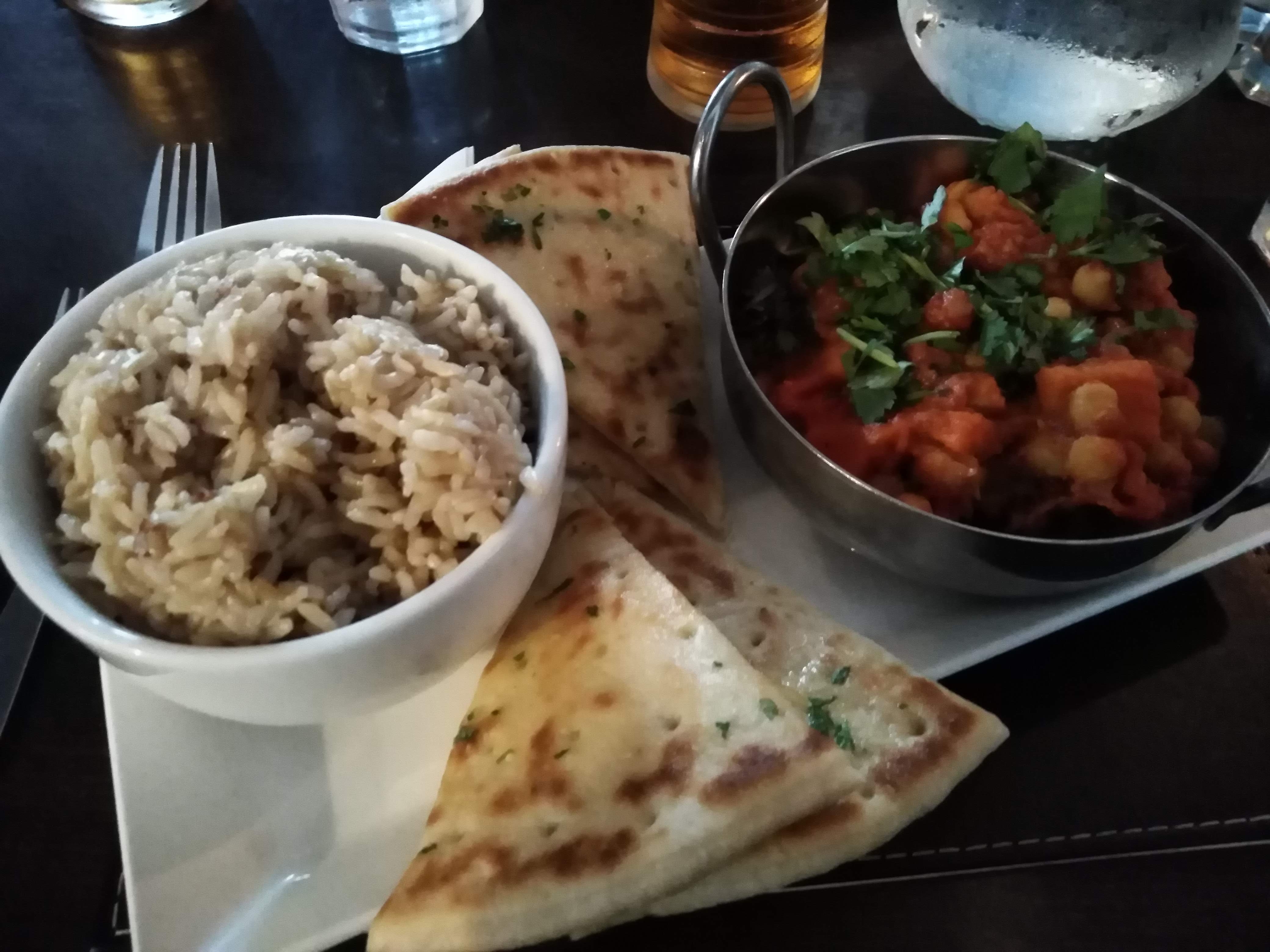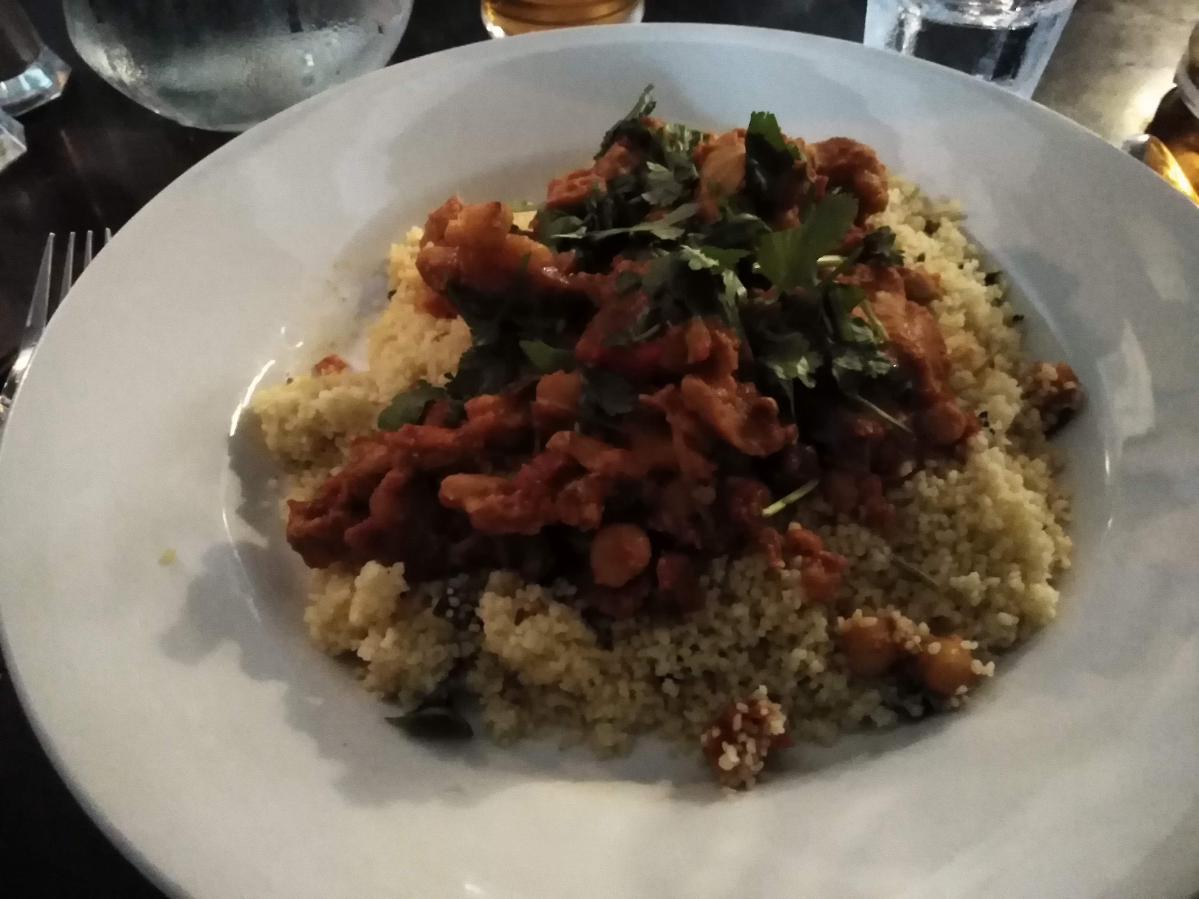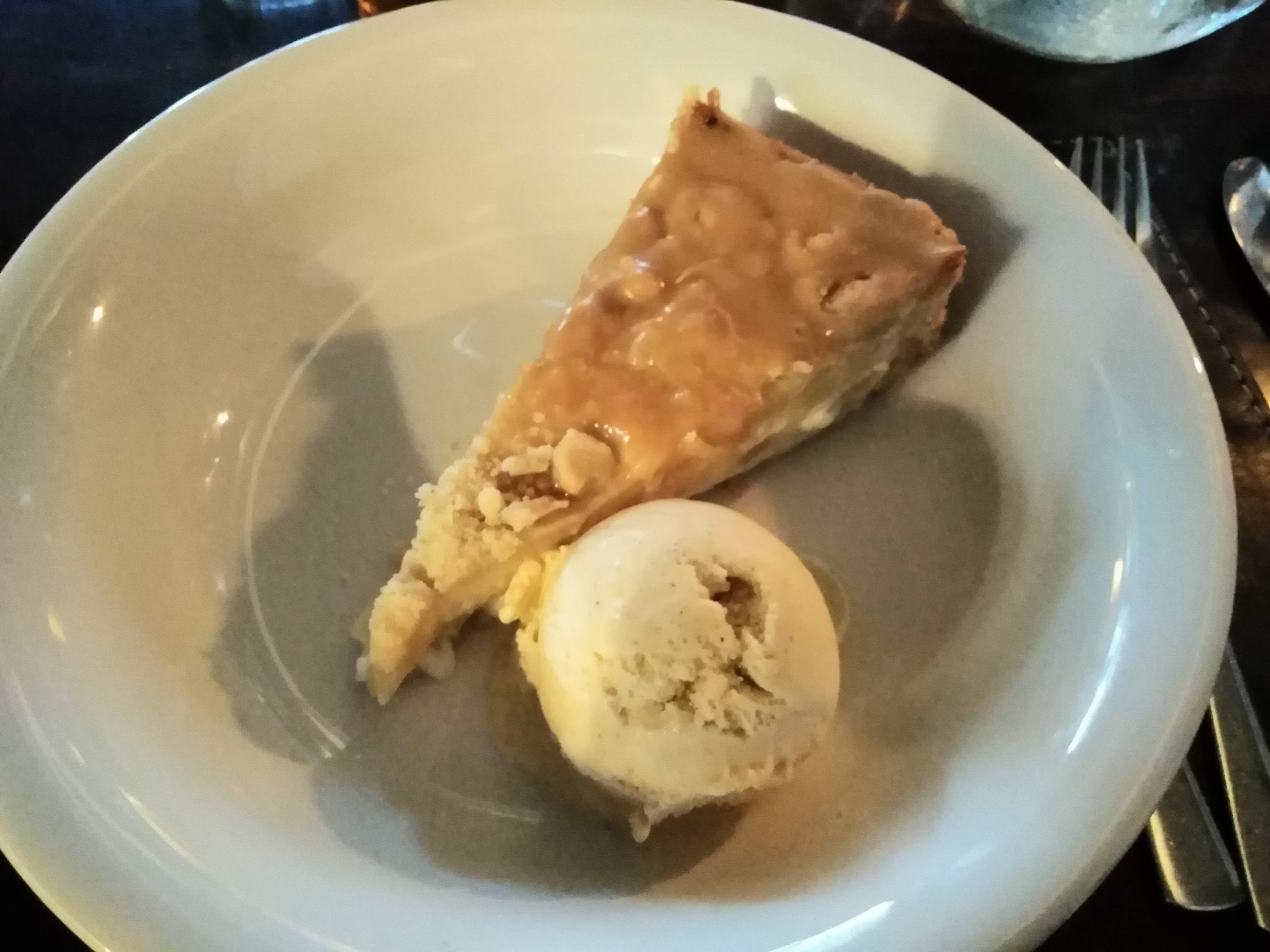 Nachdem wir uns eine Weile ausgeruht hatten, sind wir noch gegenüber im Courie Inn essen gegangen. Neben dem üblichen Pub Food gab es dort auch ein paar außergewöhnlichere Gerichte. Katharina hat sich für die Tagessuppe und als Hauptgang Marrocan Chicken Tagine entschieden. Ich habe die Vorspeise weggelassen und als Hauptgericht Chickpea & Sweet Potato Curry genommen. Und zum krönenden Abschluss habe ich mir dann auch noch eine Caramel Apple Pie mit Vanilleeis gegönnt.