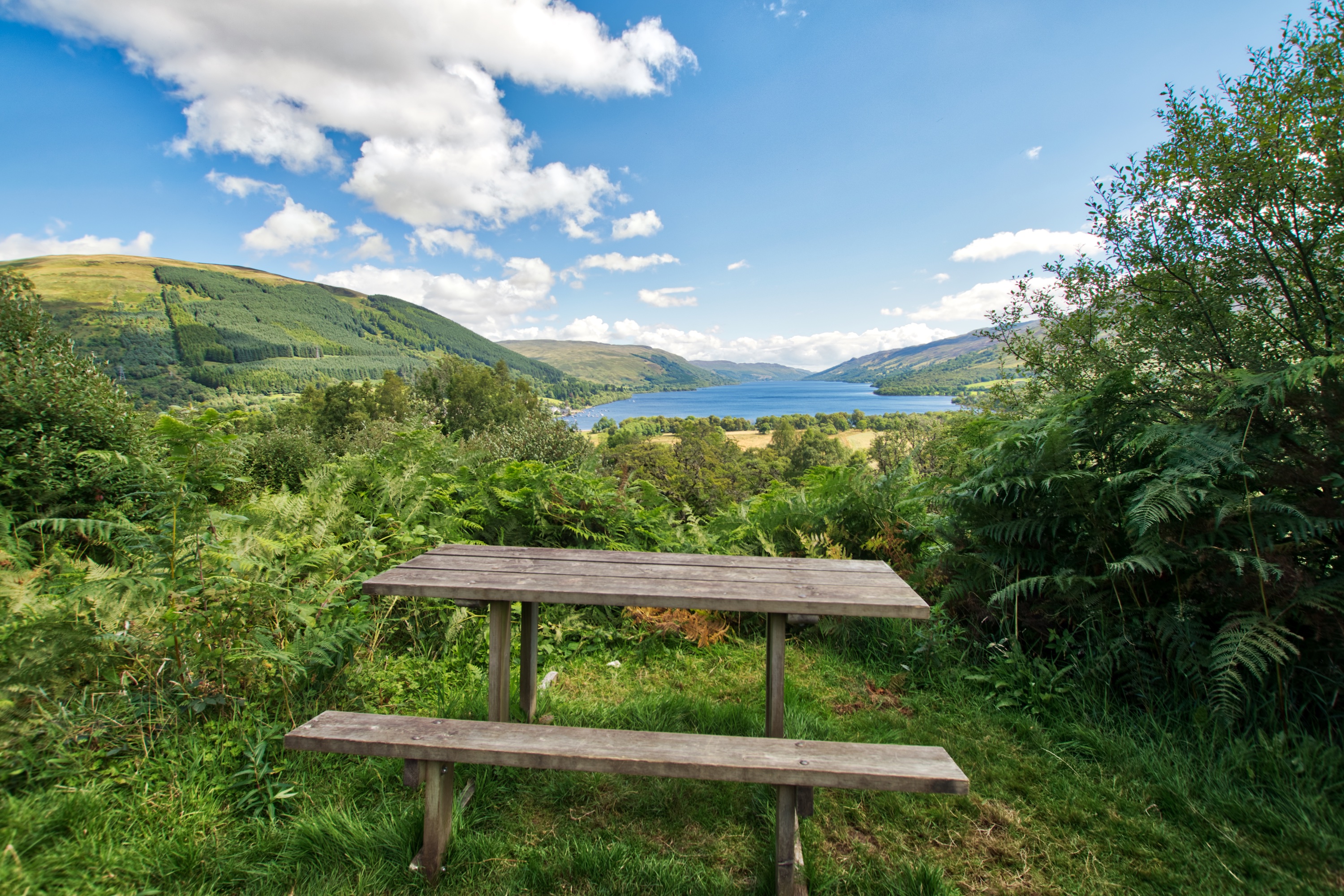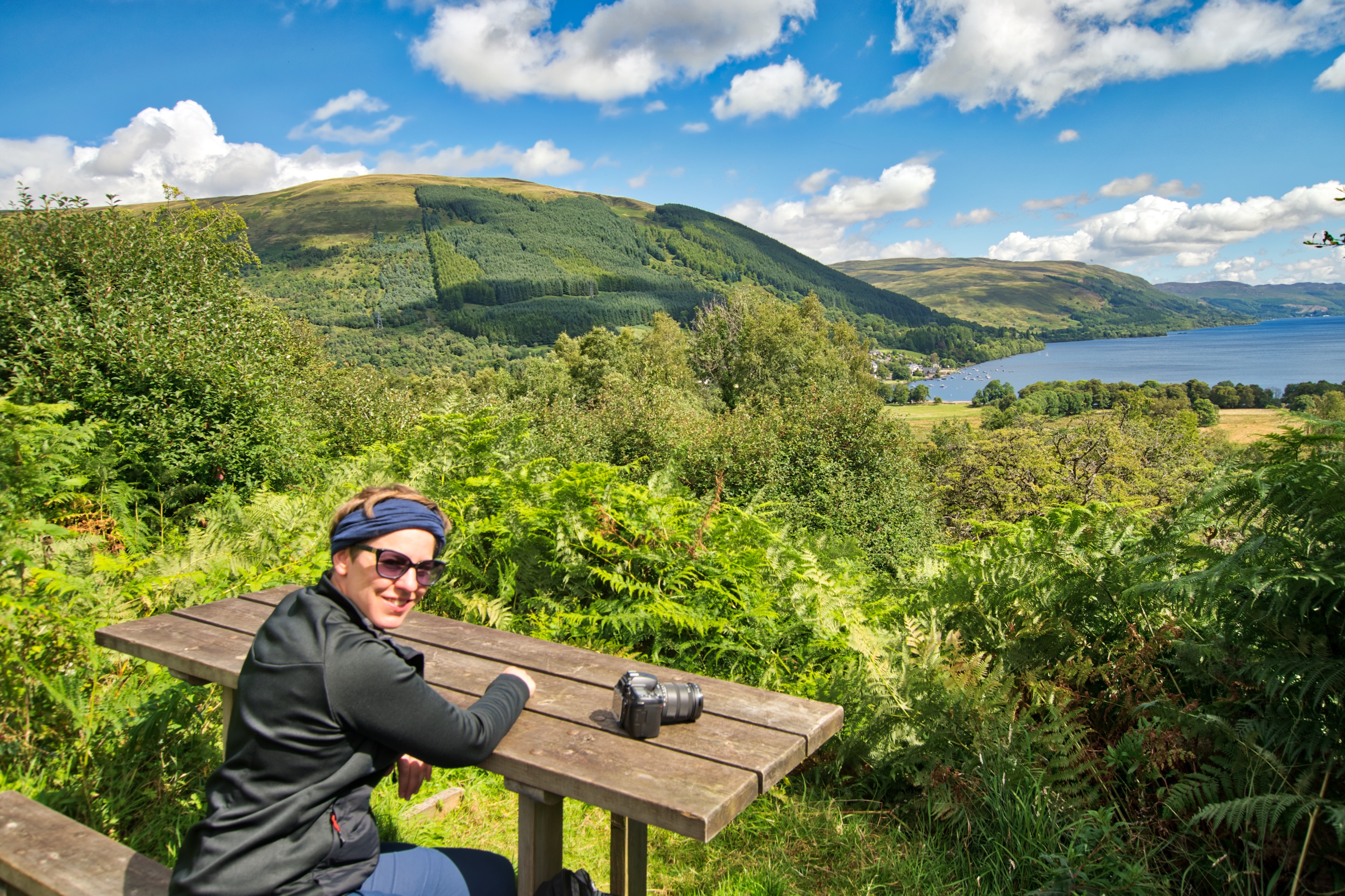 Bei Lochearnhead wandte sich der Rob Roy Way, der auch weiterhin auf der Cycle Route No. 7 verlief, von der A84 ab und es ging im Zickzack den Berg hinauf. Bereits in der ersten Kehre wartete allerdings ein Picknick-Tisch auf uns, an dem wir unsere Mittagspause gemacht haben. Einen schöneren Ort mit einer besseren Aussicht hätte man kaum finden können.