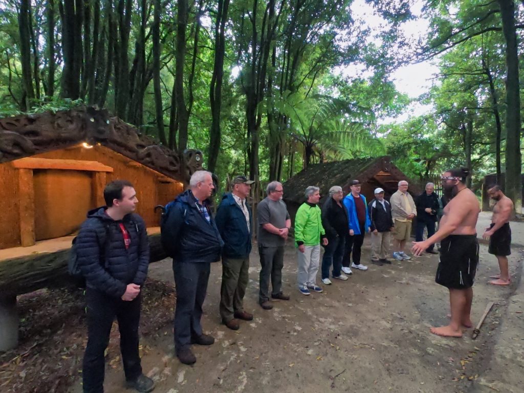 Um halb fünf kam dann der Shuttle-Bus zum Tamaki Maori Village. Schon die Busfahrt war ein Erlebnis für sich. Der Fahrer hat uns nach seiner Zählung in 61 Sprachen begrüßt. Ob das so ganz stimmt weiß ich nicht, aber es waren schon sehr viele Sprachen, u.a. natürlich Deutsch, aber auch deutlich ausgefallenere Sprachen wie Isländisch oder Zulu.