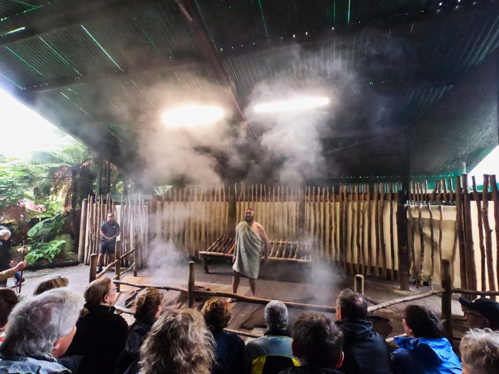 Im Anschluss ging es für uns in eine Meeting Hall, wo uns eine Maori Cultural Performance dargeboten wurde. Auch dies war natürlich extrem touristisch, aber den Haka einmal live und aus der Nähe zu sehen, den man insbesondere auch vom neuseeländischen Rugby-Team, den All Blacks, kennt, war schon ein Erlebnis.