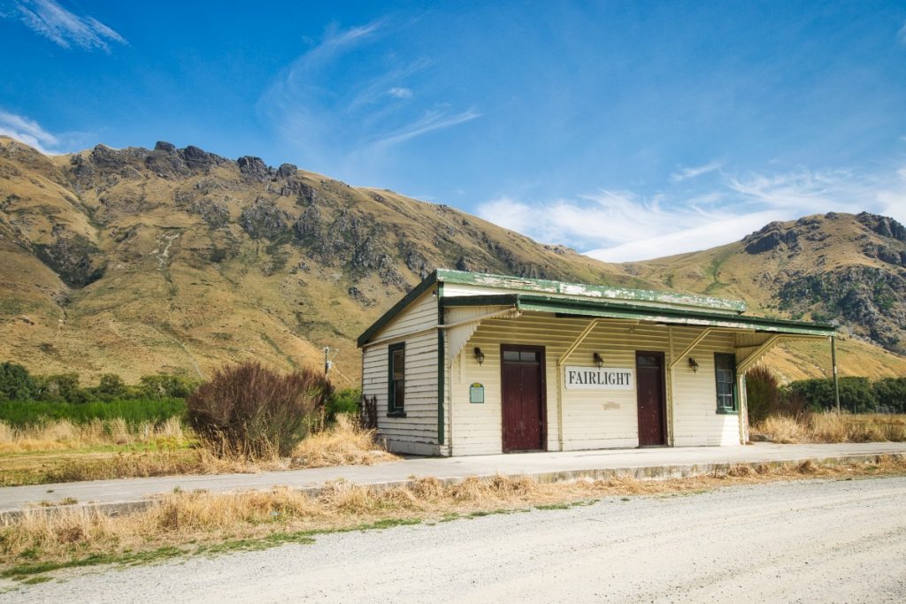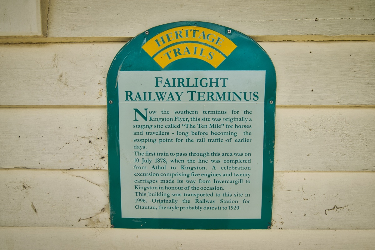 Danach bin ich weitergefahren, habe allerdings noch einen weiteren Zwischenstopp eingelegt, weil ich vergessen hatte, die Videos der letzten Tage von der GoPro auf den Computer zu transferieren und nun die Speicherkarte voll war, sodass ich keine neuen Aufnahmen mehr machen konnte. Also habe ich beim alten Fairlight Railway Terminus angehalten, meinen Laptop aus dem Kofferraum geholt und dies nachgeholt. Während die Dateien verschoben wurden, habe ich ein paar Fotos von dem alten Bahnhofsgebäude  gemacht. Der Bahnhof in Fairlight war ursprünglich eine der Haltepunkte des Kingston Flyer, der von  den späten 1890er Jahren bis ins Jahr 1957 als Passagierzug zwischen Kingston, Gore, Invercargill und hin und wieder auch Dunedin verkehrte. Ab 1971 wurde der Kingston Flyer wieder betrieben – als Touristenzug. Seit 2012 fährt er allerdings nicht mehr.