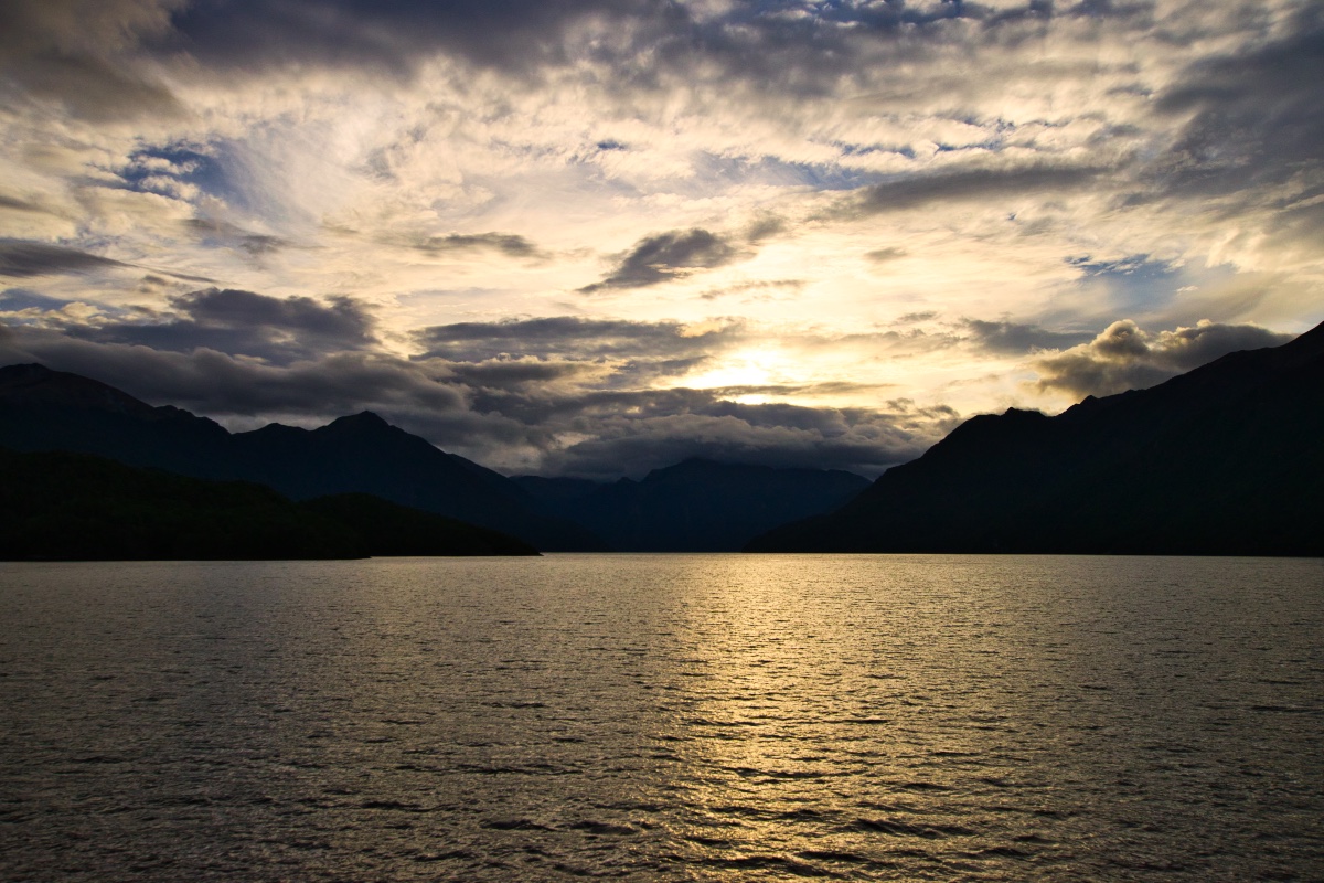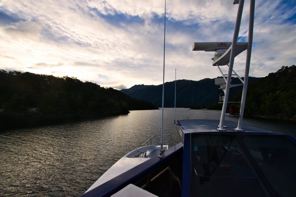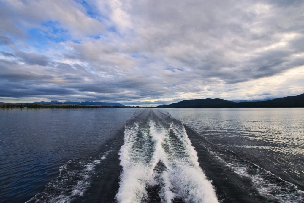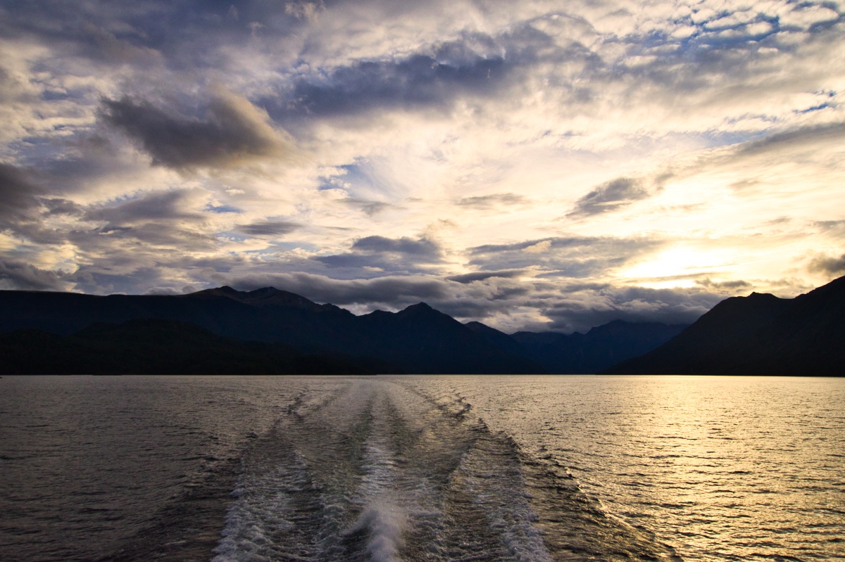 Pünktlich um 19 Uhr haben wir am Bootsanleger in Te Anau abgelegt und uns auf den Weg zum westlichen Ufer des Lake Te Anau zur Glowworm Cave gemacht. Auf der Hinfahrt konnte ich einige schöne Bilder vom Abendhimmel machen.