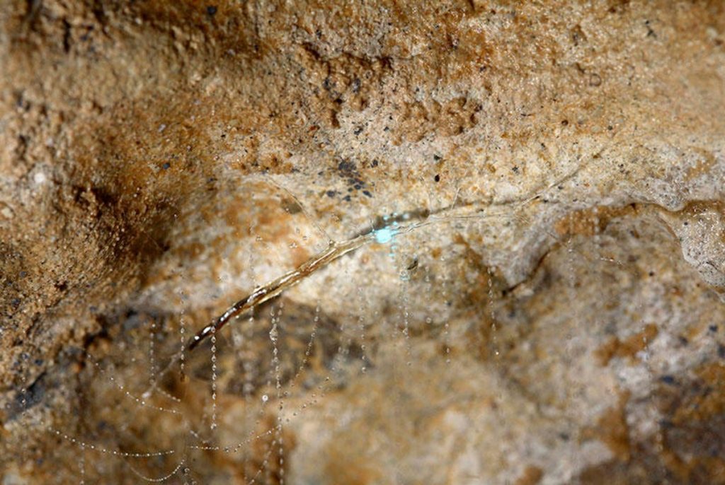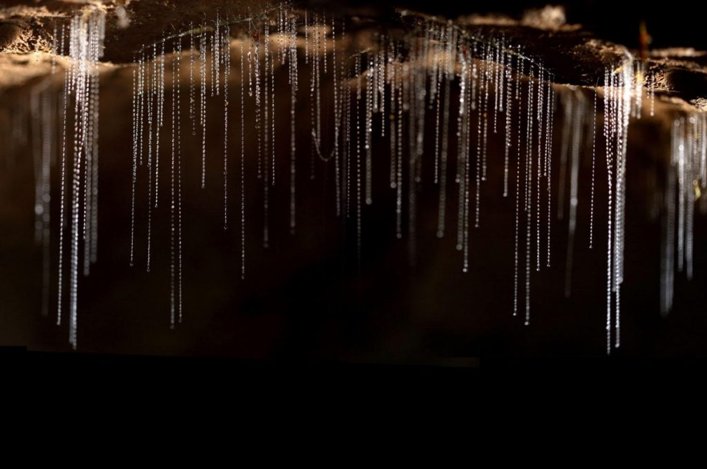 Die Larve spinnt ein Seidennest an der Höhlendecke und lässt bis zu 70 mit Schleimtropfen versehene, bis 40 cm lange Seidenfäden herabhängen. Die durch im Wald lebende Exemplare gebauten Fangfäden sind viel kürzer und erreichen nur etwa 5 cm Länge, da sie sich sonst im Wind ineinander verfangen.