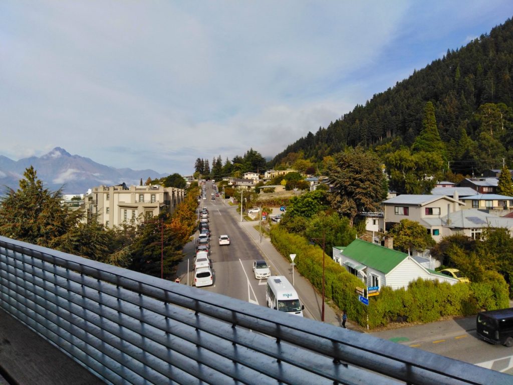 Das Frühstück aufs Haus war zwar lecker (Chia-Pudding mit Banane und Kiwimus), aber doch ziemlich klein. Immerhin konnte ich beim Frühstück die Aussicht auf die Berge rund um Queenstown genießen.
