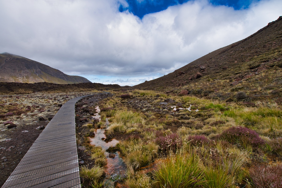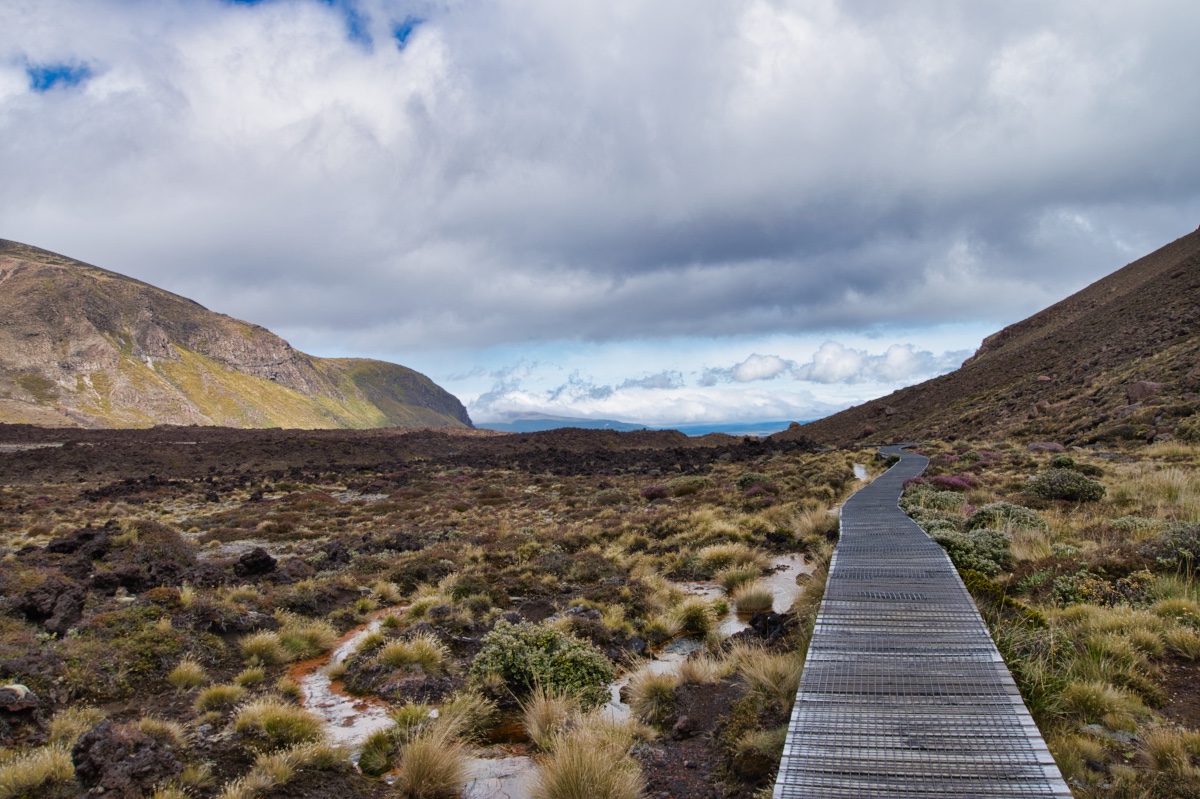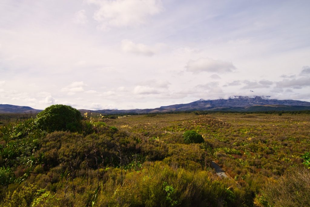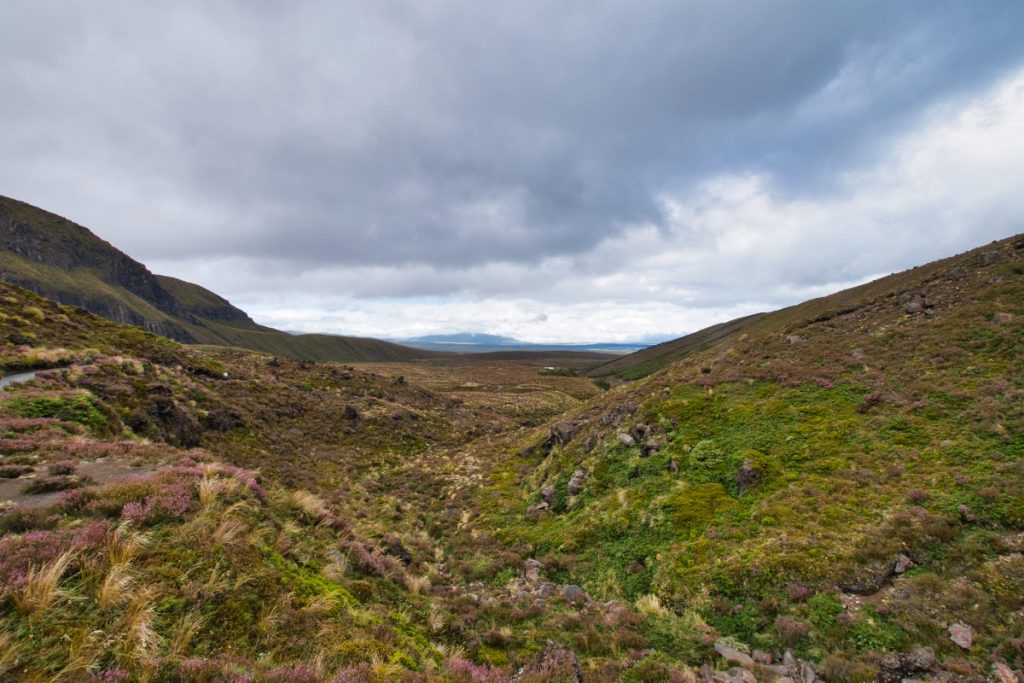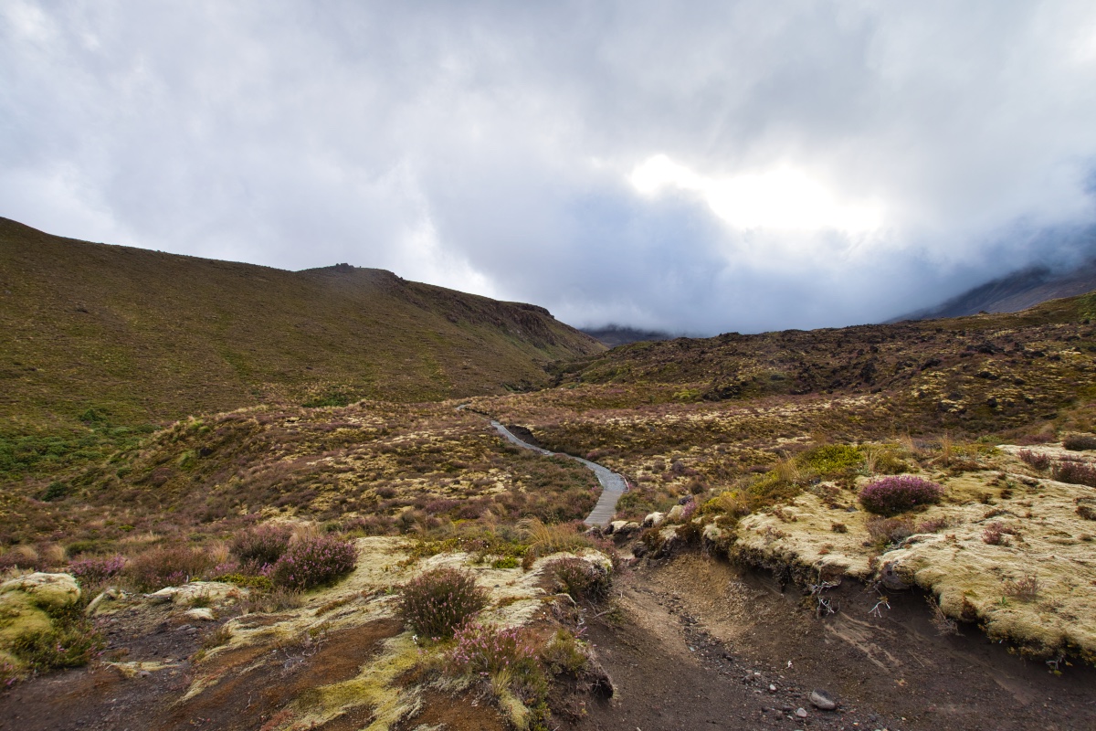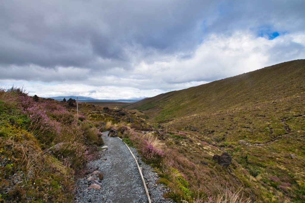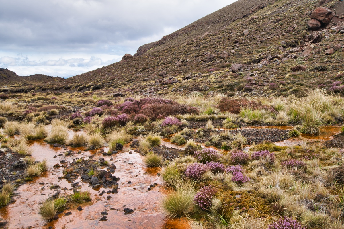 Der erste Teil der Wanderung durch das Mangatepopo Valley war sehr angenehm zu laufen. Der Weg war gut ausgebaut und über weite Strecken gab es sogar einen Boardwalk. Die Heide lässt den Tongariro Nationalpark ein bisschen aussehen wie die schottischen Highlands. Die Pflanzen sind allerdings nicht in Neuseeland heimisch, sondern wurden vor über hundert Jahren angepflanzt, weil man versuchen wollte, im Tongariro Nationalpark Auerhähne auszuwildern und so- wie in Schottland – Grouse Shooting zu etablieren. Die Heide ist eine echte Pest, aber sie kommt mit dem vulkanischen Boden sehr gut zu recht und ist schwierig auszumerzen.