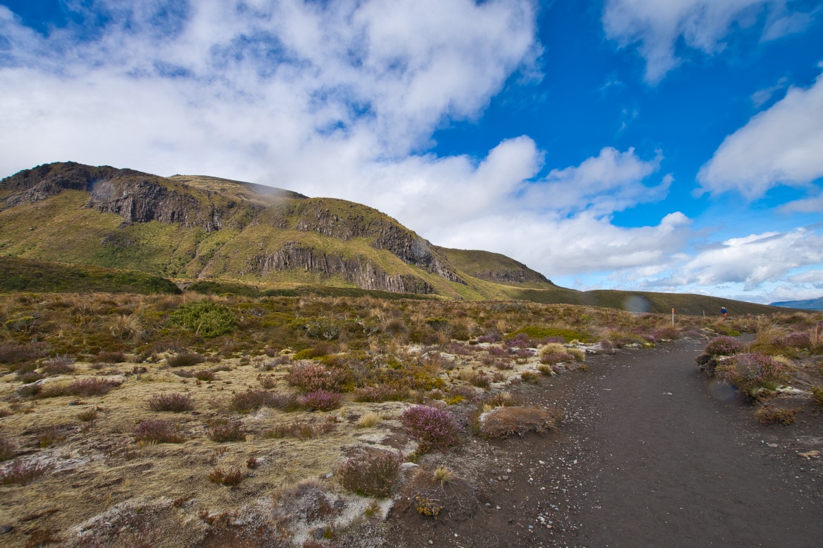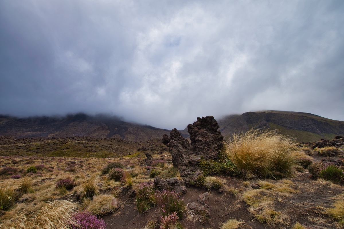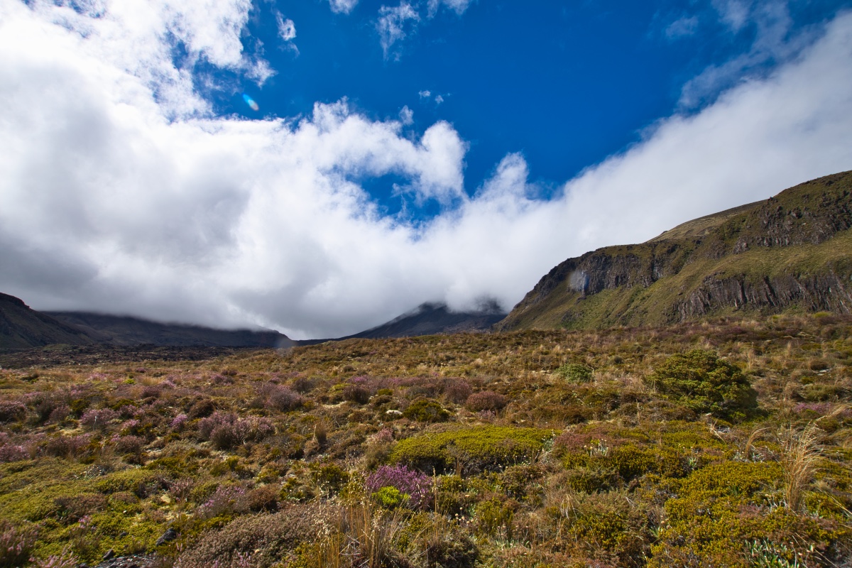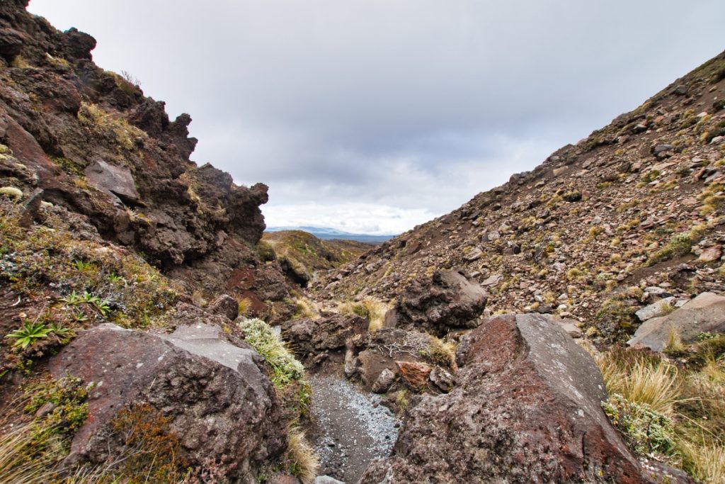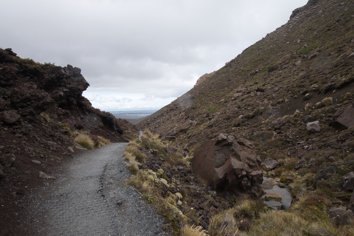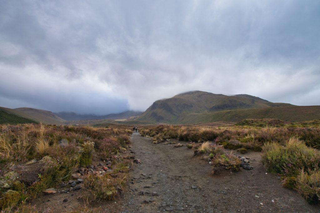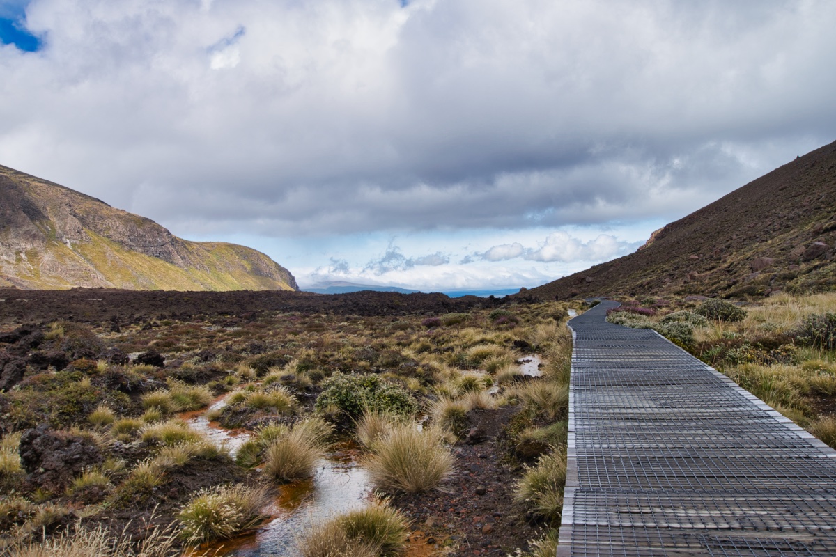 Der erste Teil der Wanderung durch das Mangatepopo Valley war sehr angenehm zu laufen. Der Weg war gut ausgebaut und über weite Strecken gab es sogar einen Boardwalk. Die Heide lässt den Tongariro Nationalpark ein bisschen aussehen wie die schottischen Highlands. Die Pflanzen sind allerdings nicht in Neuseeland heimisch, sondern wurden vor über hundert Jahren angepflanzt, weil man versuchen wollte, im Tongariro Nationalpark Auerhähne auszuwildern und so- wie in Schottland – Grouse Shooting zu etablieren. Die Heide ist eine echte Pest, aber sie kommt mit dem vulkanischen Boden sehr gut zu recht und ist schwierig auszumerzen.