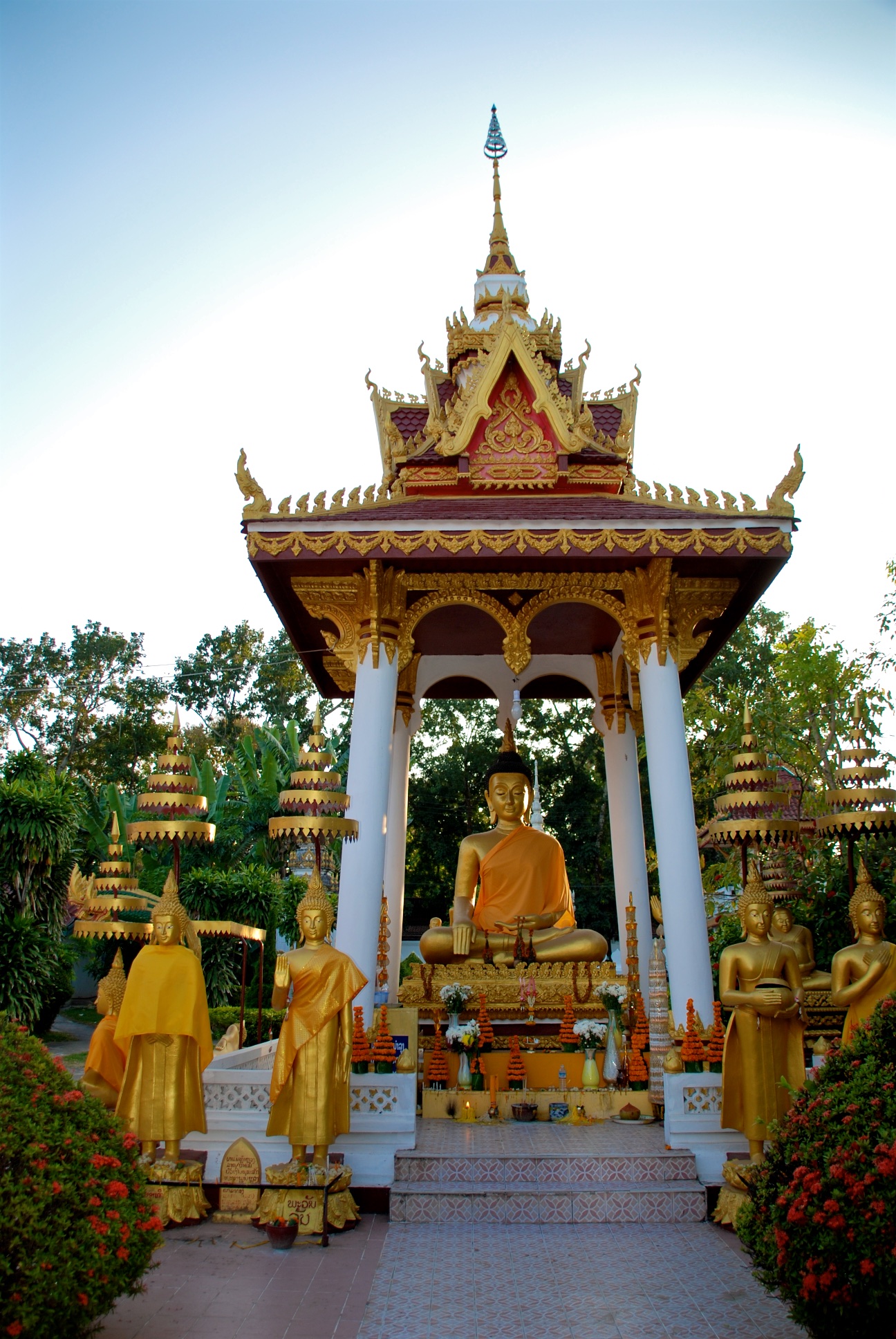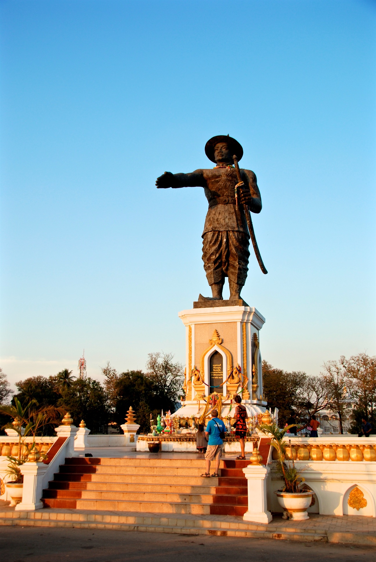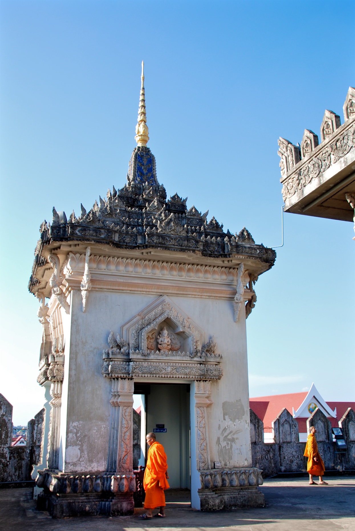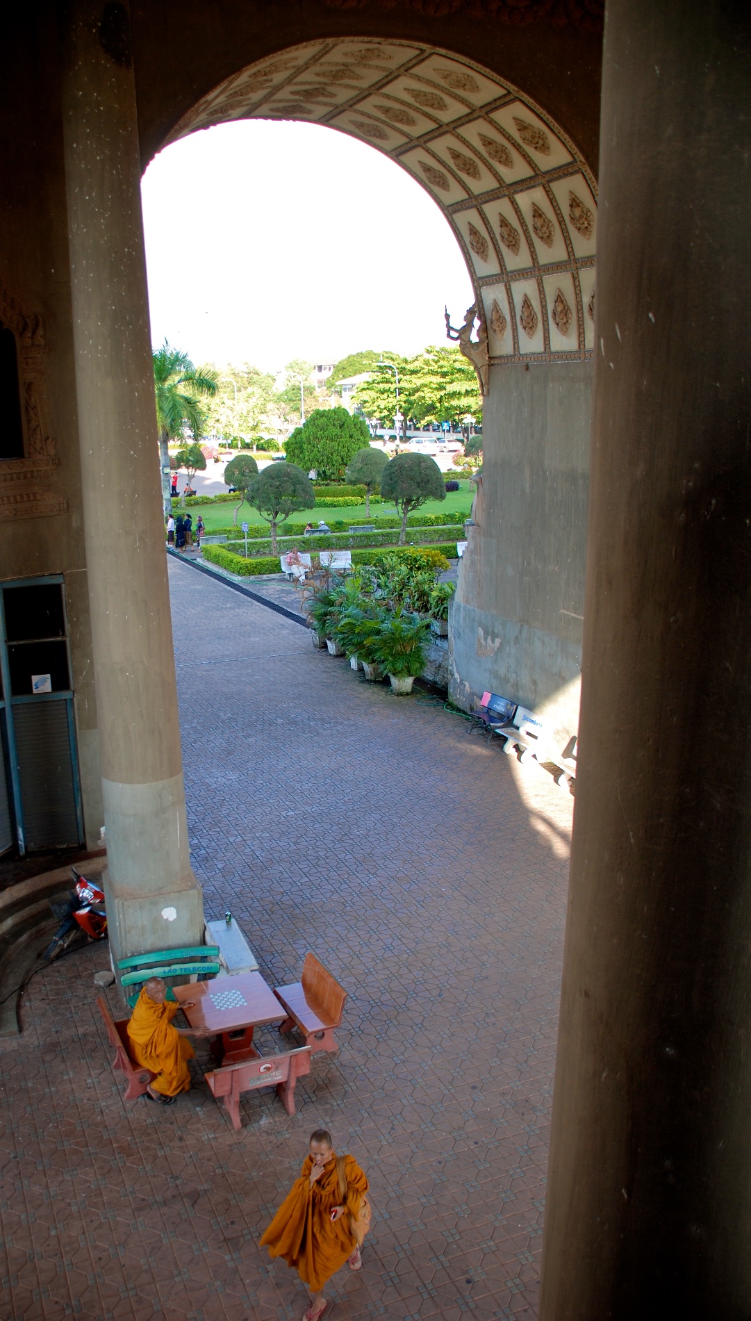 Am Patouxai, oder Siegestor, habe ich die Gruppe dann zufällig wiedergetroffen, die dort auch gerade mit dem Bus einen kurzen Halt gemacht hatte. Von dort bin ich vorbei am Salat Tao Markt zum That Dam gelaufen, einer Stupa mitten auf eine wenig befahrenen Kreisverkehr. Weiter ging es vorbei am Nam Phou Platz mit seinem Springbrunnen zum Präsidentenpalast und dem Tempel Wat Sisaket. Leider war der Tempel schon geschlossen, sodass ich ihn nur von außen betrachten konnte. Gleiches galt leider auch für den heute als Museum genutzten Tempel Haw Pha Kaew. Am Ufer des Mekong bin ich dann wieder Richtung Hotel gelaufen.