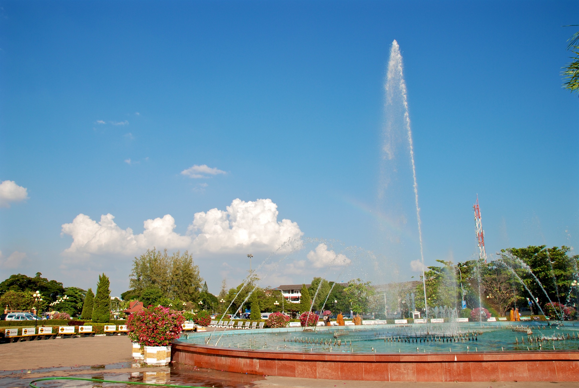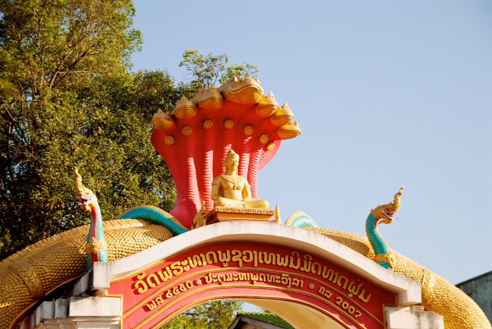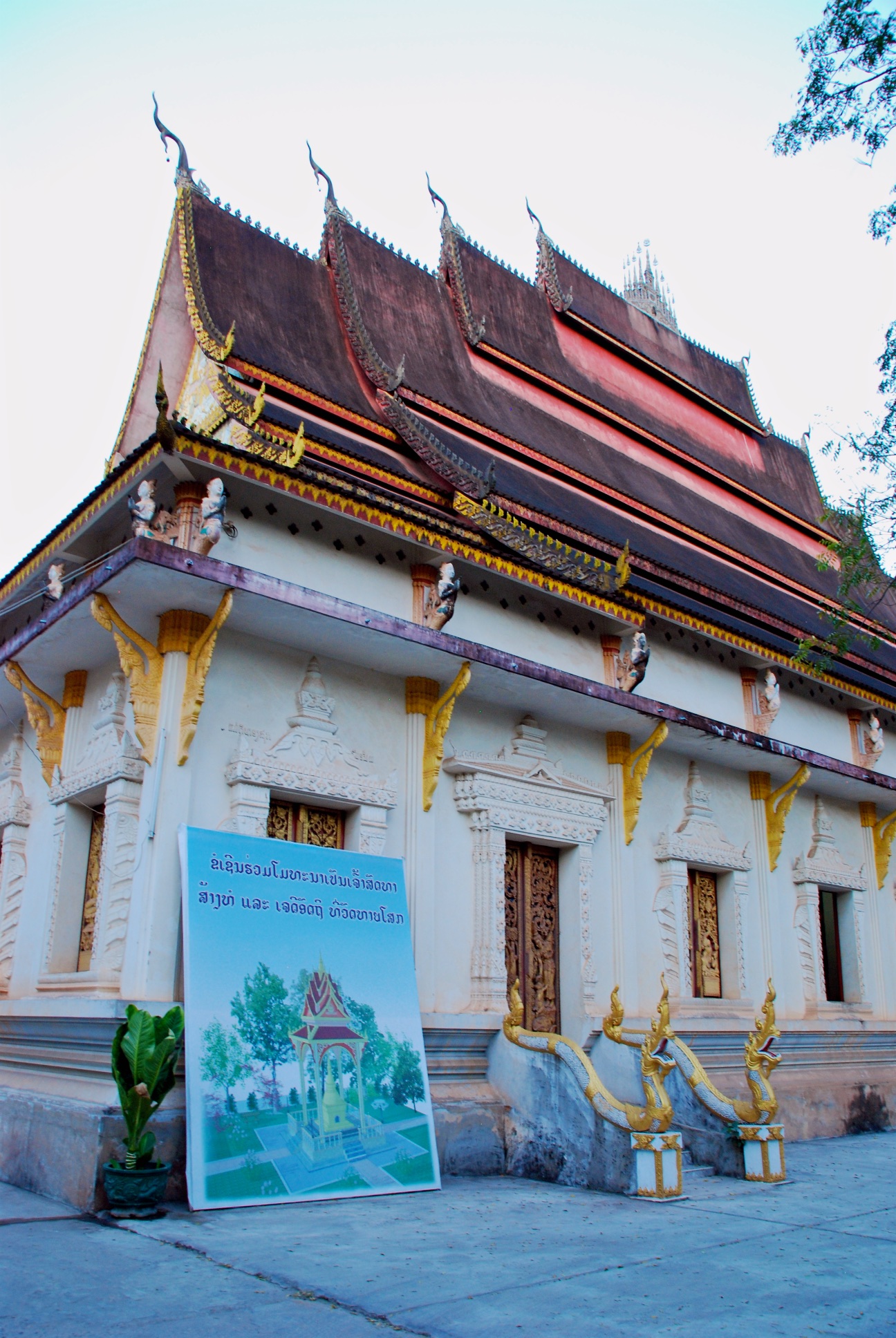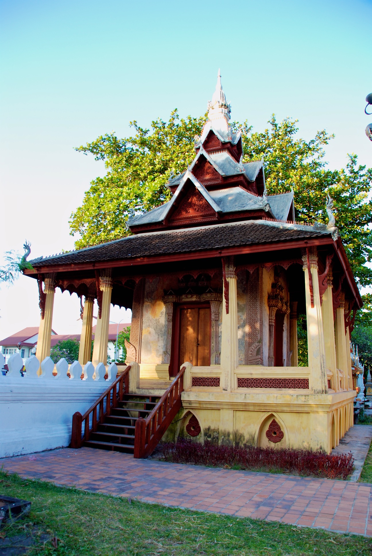Am Patouxai, oder Siegestor, habe ich die Gruppe dann zufällig wiedergetroffen, die dort auch gerade mit dem Bus einen kurzen Halt gemacht hatte. Von dort bin ich vorbei am Salat Tao Markt zum That Dam gelaufen, einer Stupa mitten auf eine wenig befahrenen Kreisverkehr. Weiter ging es vorbei am Nam Phou Platz mit seinem Springbrunnen zum Präsidentenpalast und dem Tempel Wat Sisaket. Leider war der Tempel schon geschlossen, sodass ich ihn nur von außen betrachten konnte. Gleiches galt leider auch für den heute als Museum genutzten Tempel Haw Pha Kaew. Am Ufer des Mekong bin ich dann wieder Richtung Hotel gelaufen.