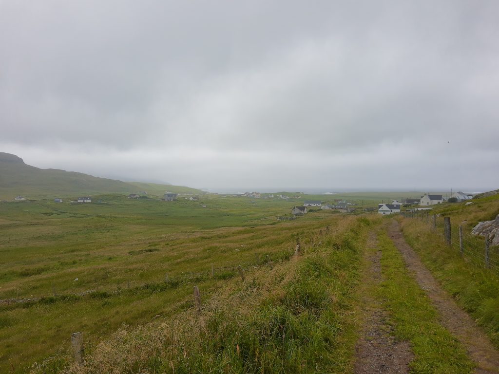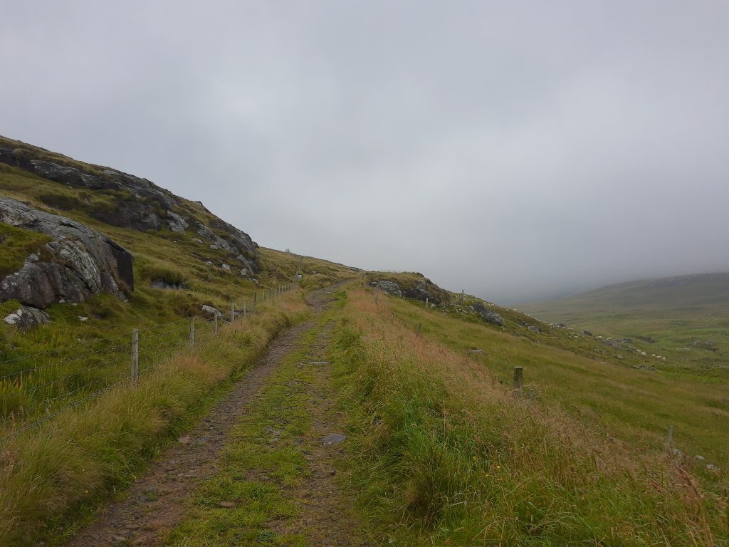 Unsere zweite Etappe hat uns dann von Borve nach Ardmhor zur Fähre nach Eriskay geführt und auf Eriskay noch bis zur Kilbride Campsite. Wir sind gegen 10 Uhr am Campingplatz losgelaufen. Es nieselte leicht.