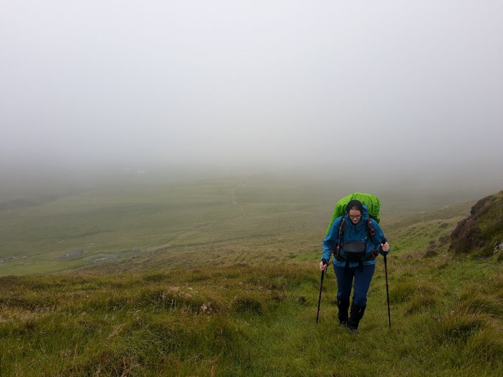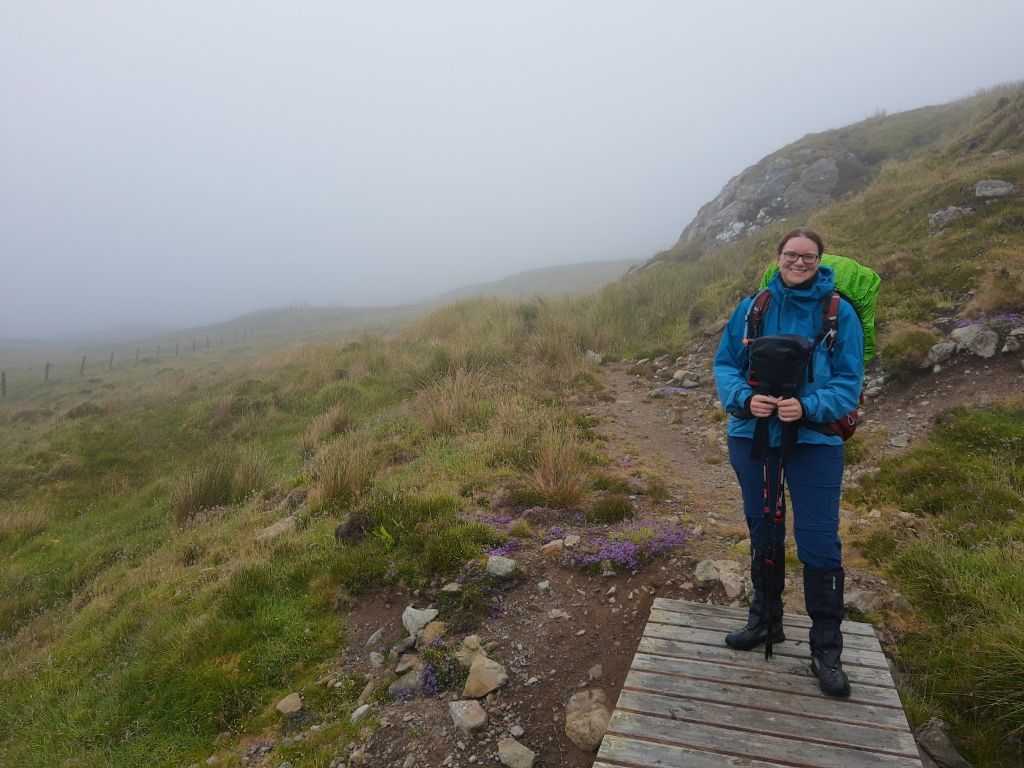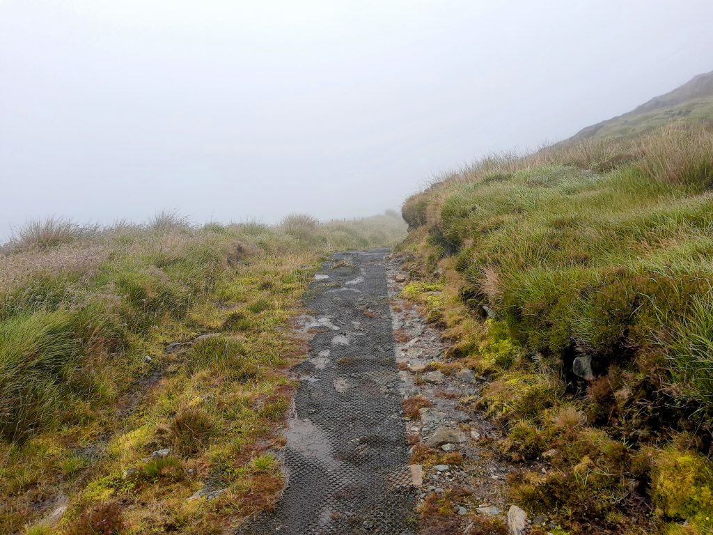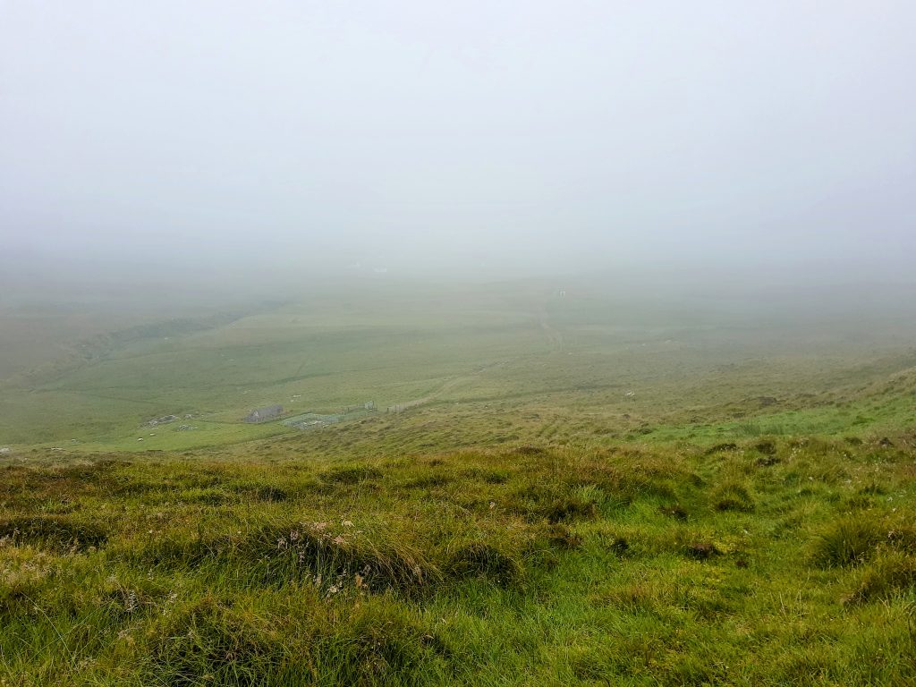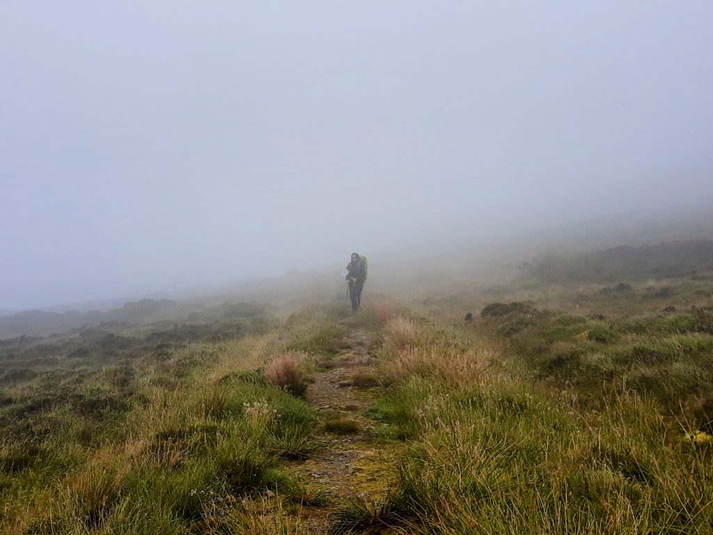 Als wir oben waren, war es nebelig. Erstmal haben wir uns ein bisschen verlaufen, wahrscheinlich sind wir schon den Hügel an der falschen Stelle hochgelaufen. Mit dem Navigationsgerät haben wir den Weg aber zum Glück wieder gefunden. Der Weg war jetzt eher flach, aber sehr, sehr matschig.
