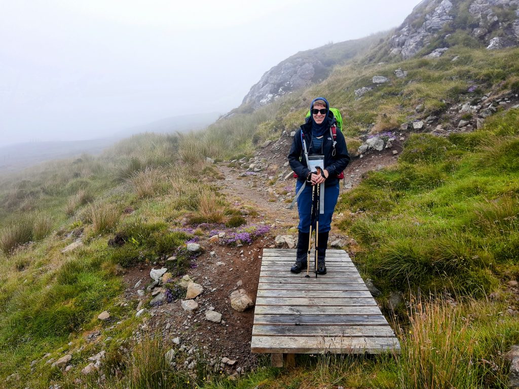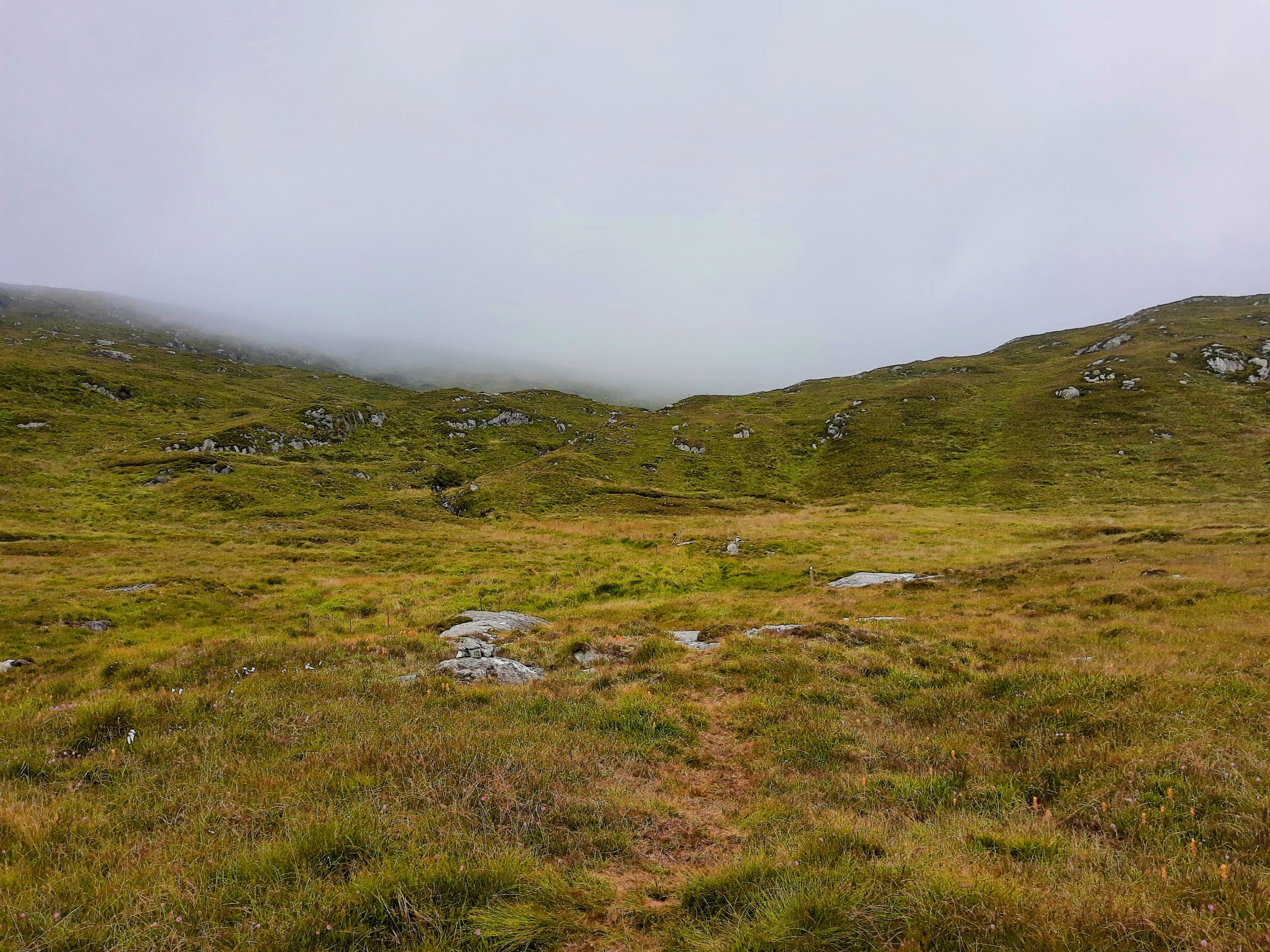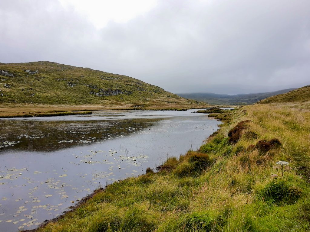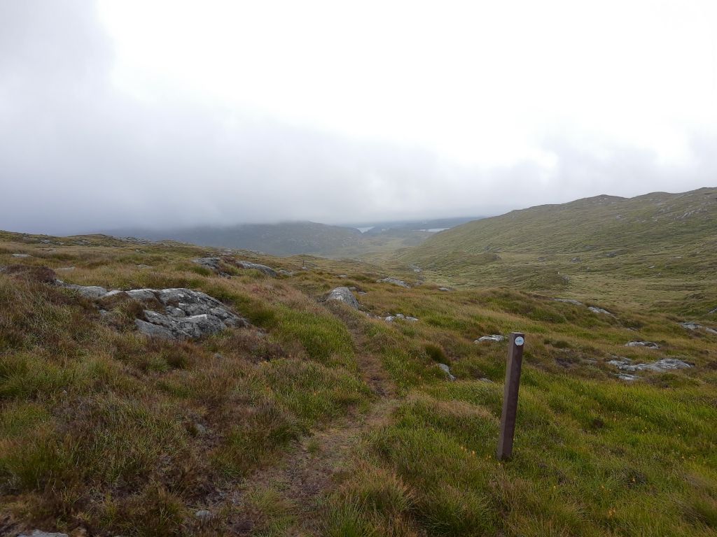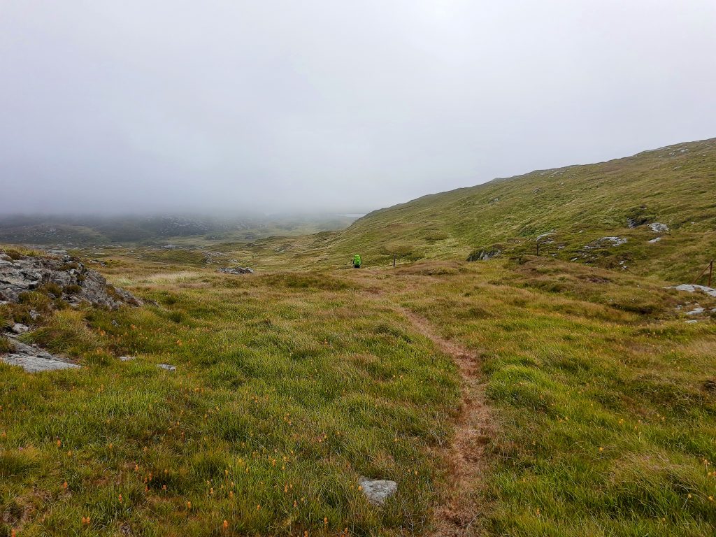 Nach einem weiteren kurzen Anstieg ging es eigentlich nur noch begab. Allerdings war das Gelände weiterhin sehr morastig, sodass man sehr gut gucken musste, wo man hintritt. Katharina hat leider nasse Füsse bekommen. Aber die Landschaft war ansonsten traumhaft – genauso, wie wir es uns vorgestellt hatten für unsere Wanderung. Sehr abgelegen und ruhig.