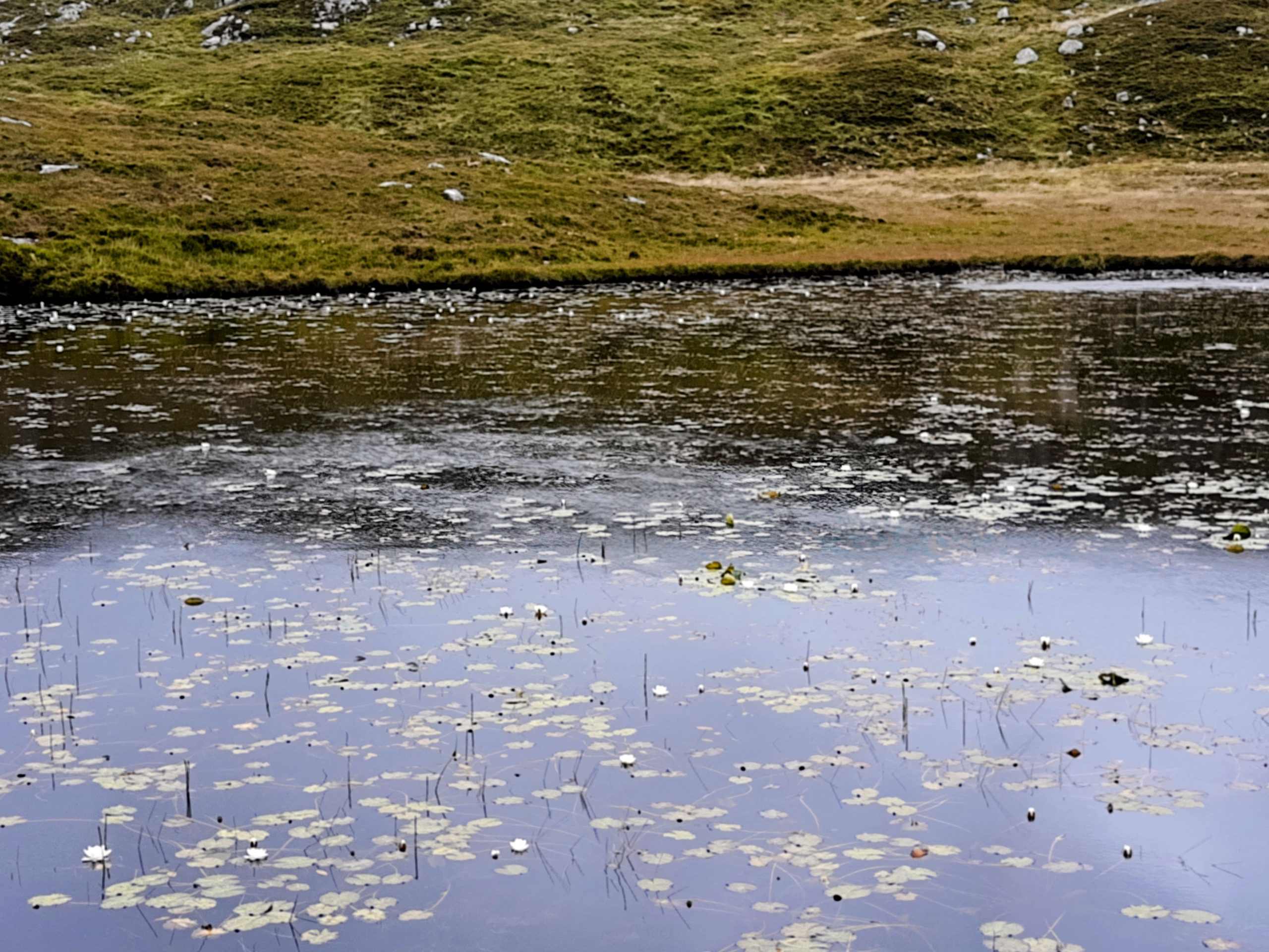 Die Seen waren sehr schön, sogar mit Seerosen. Bis hier her hatten wir eigentam Vortag laufen wollen. Das hätten wir angesichts des schwierigen Geländes schon nicht geschafft. Aber selbst wenn wir es geschafft hatten, hätten wir hier keinen Platz gefunden, um unser Zelt aufzustellen. Alles viel zu nass.